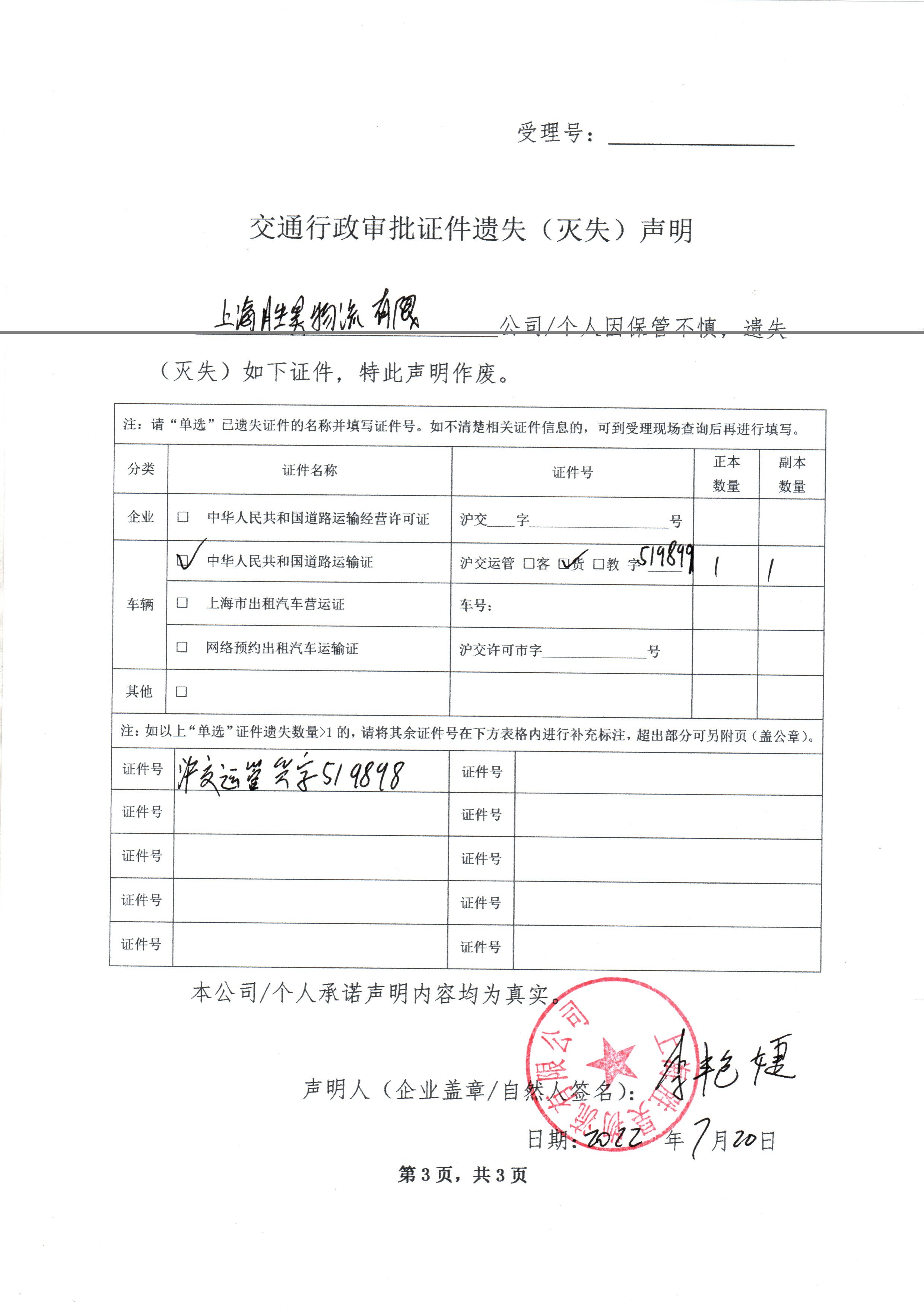 上海胜昊物流有限公司道路运输证(证件号:沪交运管货字519899等2本)遗失声明