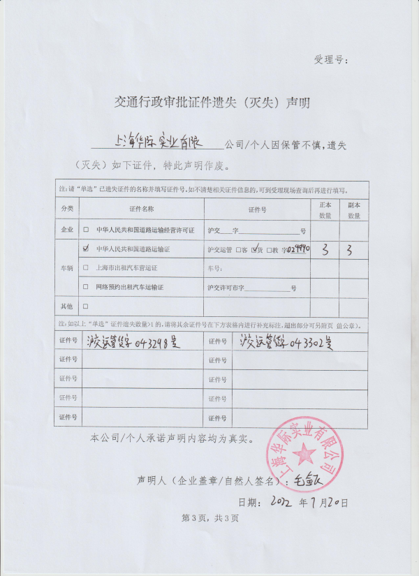 上海华际实业有限公司道路运输证(证件号:沪交运管货字024990等3本)遗失声明