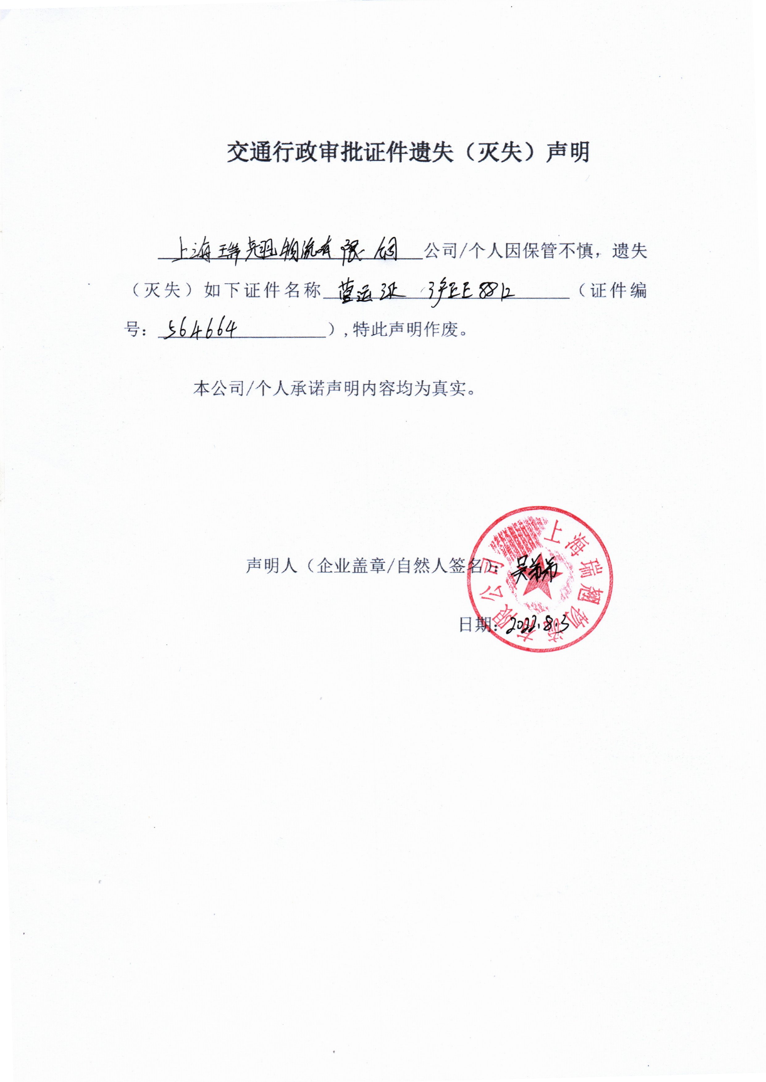 上海瑞翘物流有限公司道路运输证(证件号:沪交运管货字564664)遗失声明