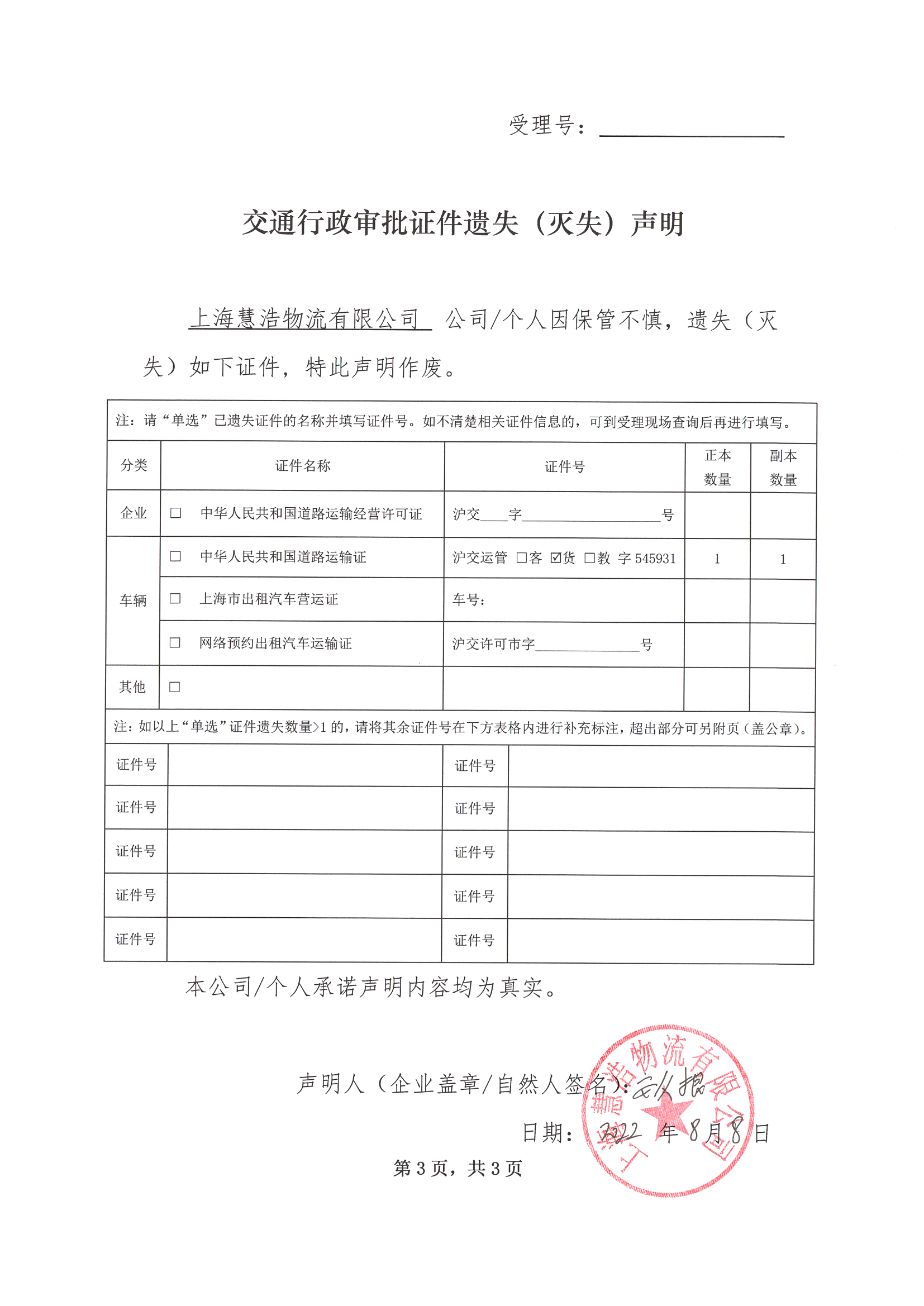 上海慧浩物流有限公司道路运输证(证件号:沪交运管货字545931)遗失声明