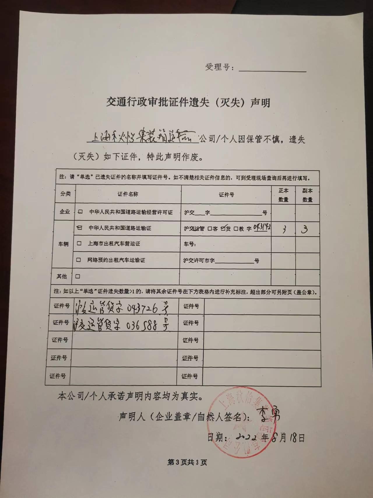 上海秋怡集装箱运输有限公司道路运输证(证件号:沪交运管货字043726等2本)遗失声明