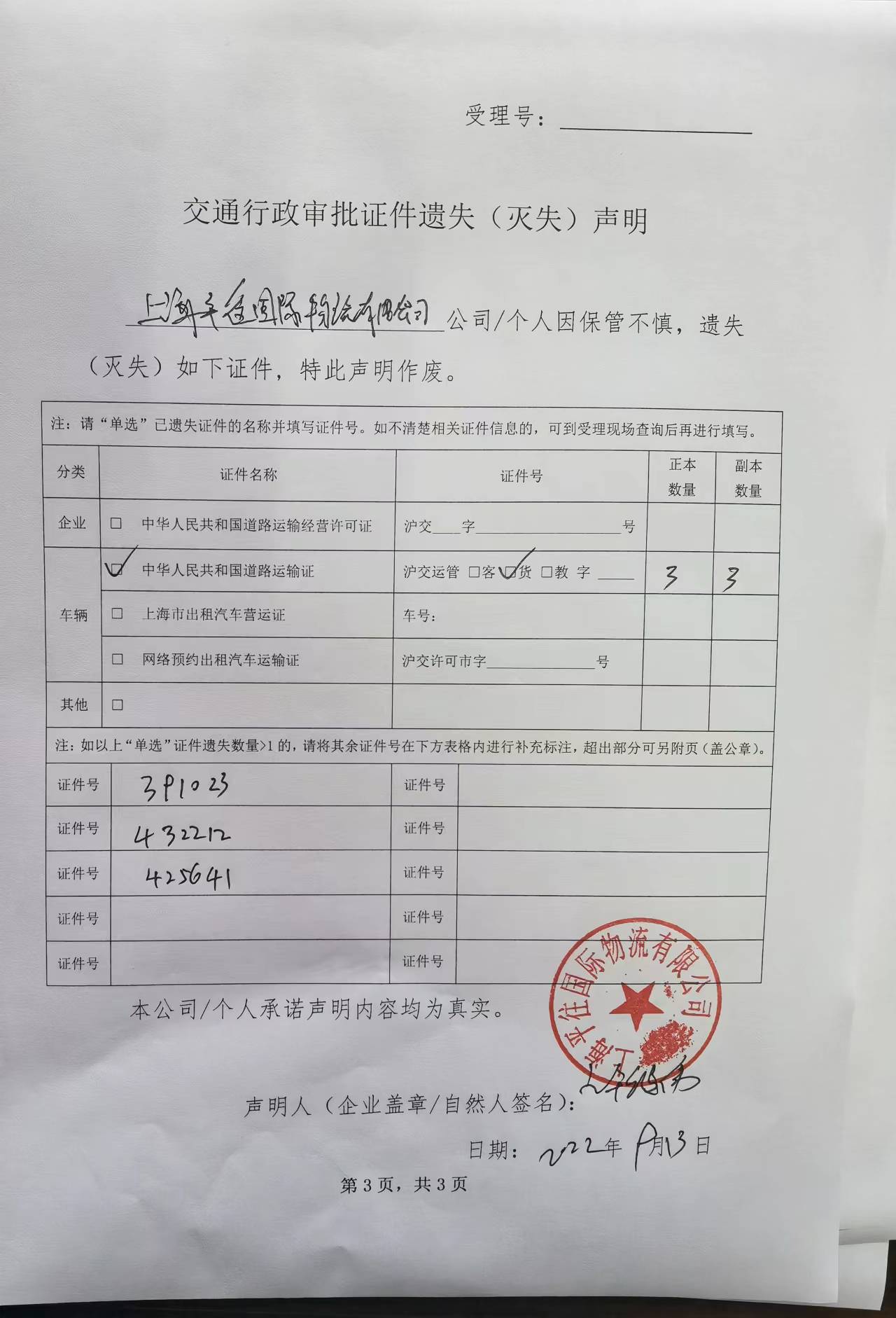 上海平往国际物流有限公司道路运输证(证件号:沪交运管货字391023等3本)遗失声明