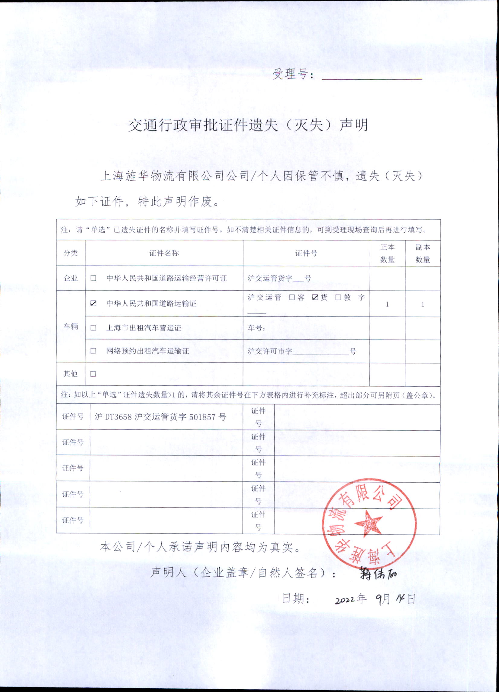 上海旌华物流有限公司道路运输证(证件号:沪交运管货字501857)遗失声明