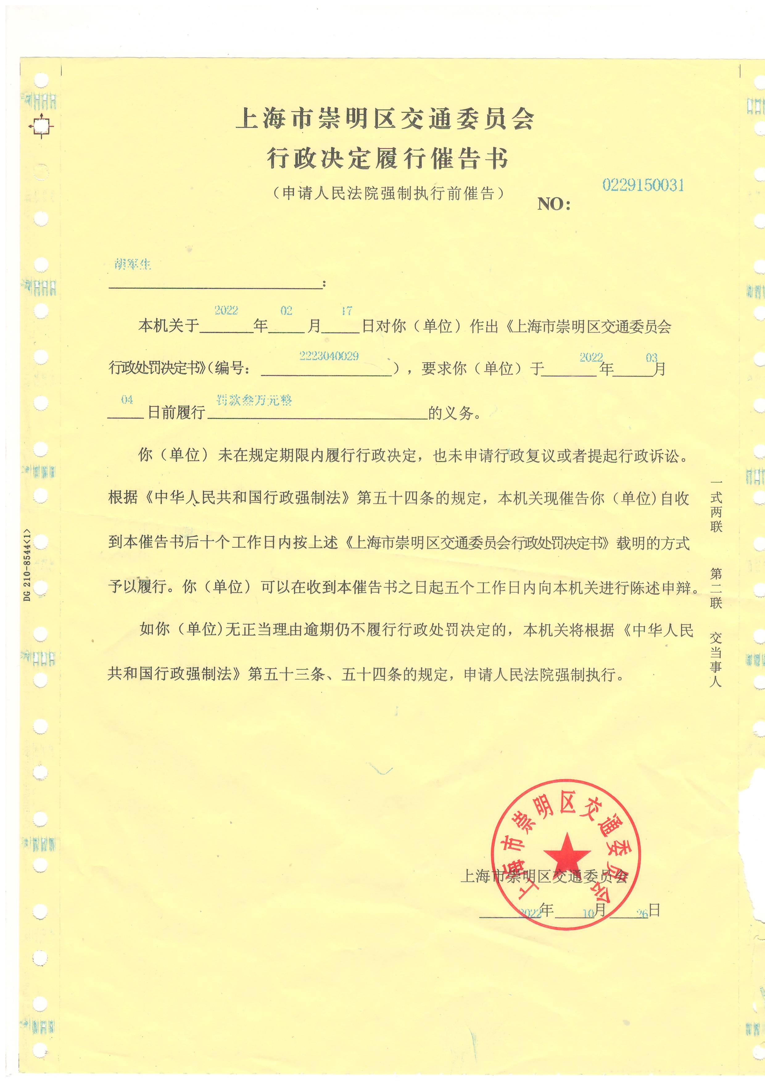 1 | 上海市崇明区交通委员会行政决定履行催告书 | 0229150031 | 胡军生 | 常州市洛阳镇戴溪大队虎臣村板桥头23号 | 2022.10.31 |