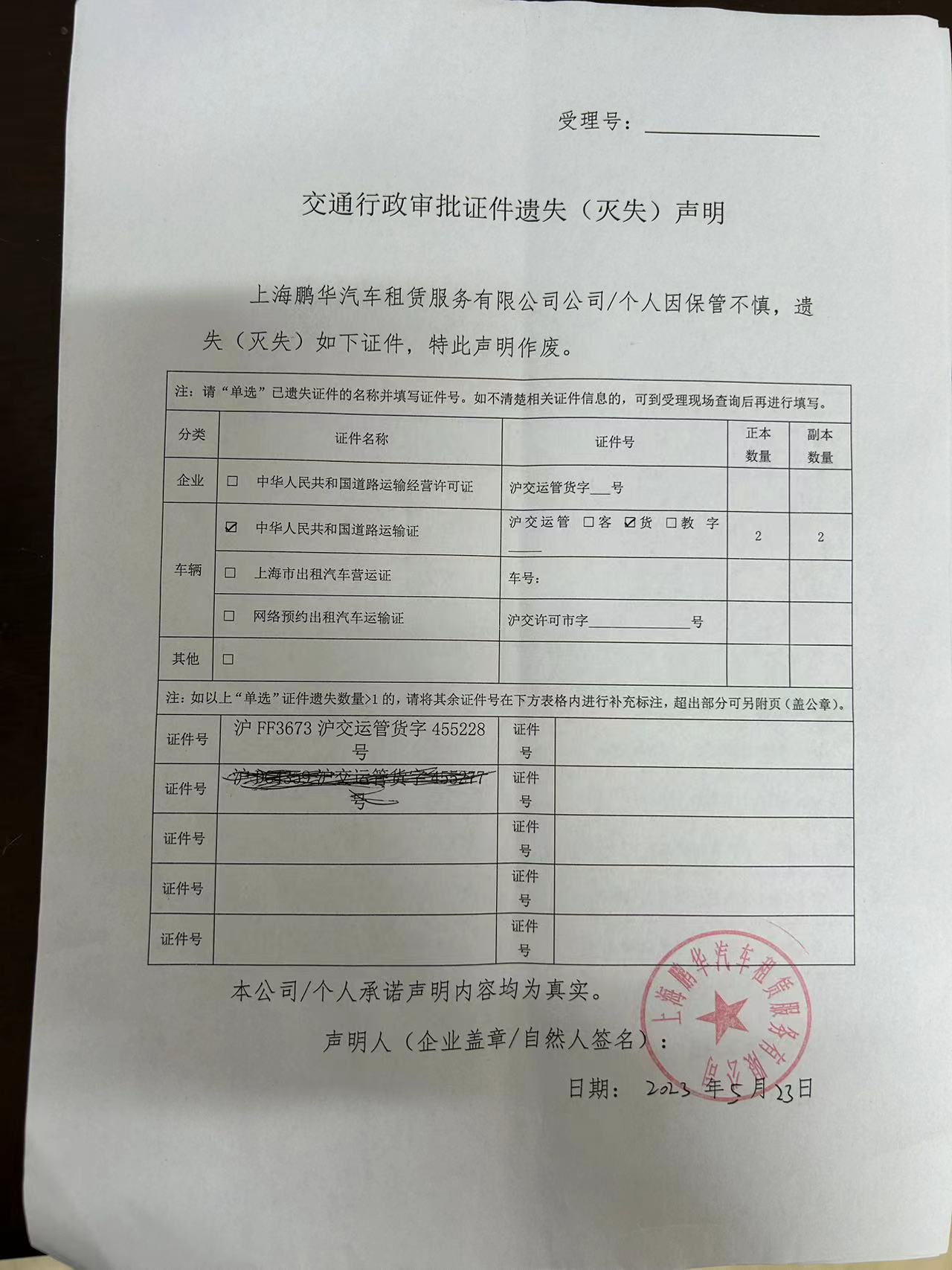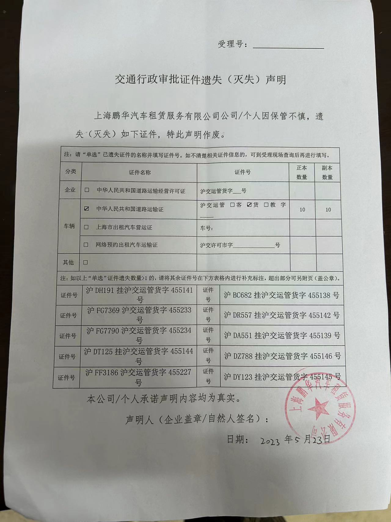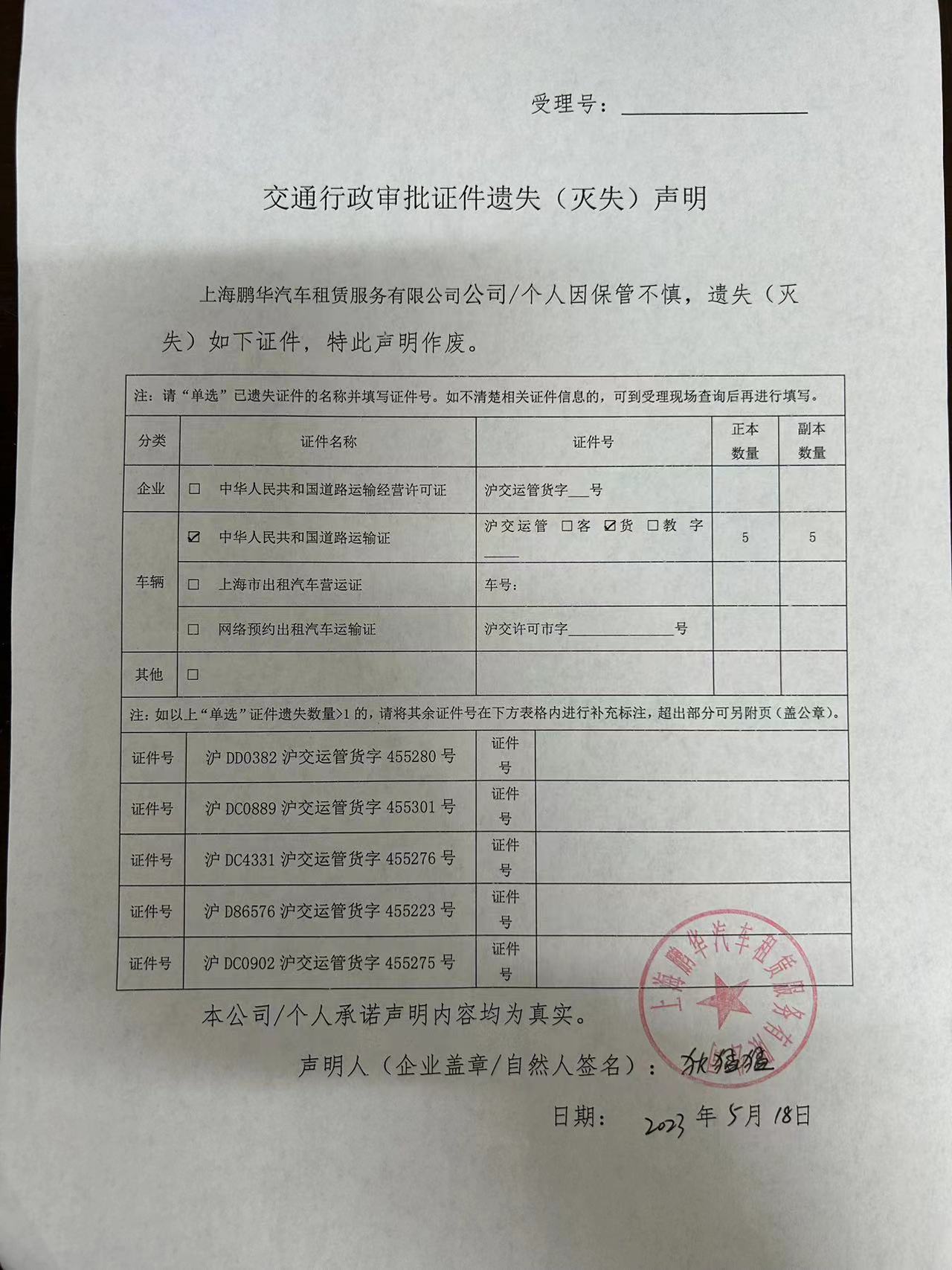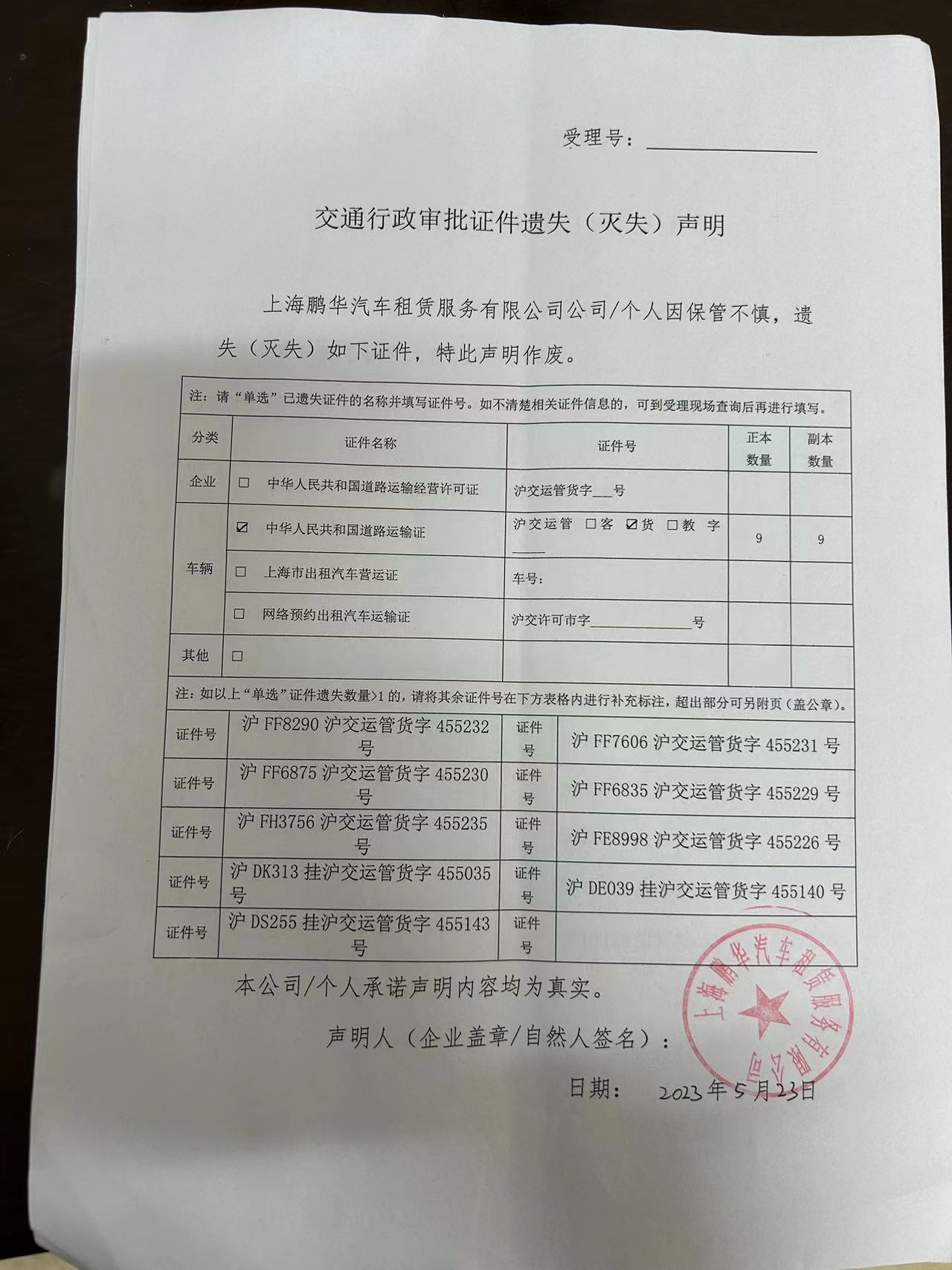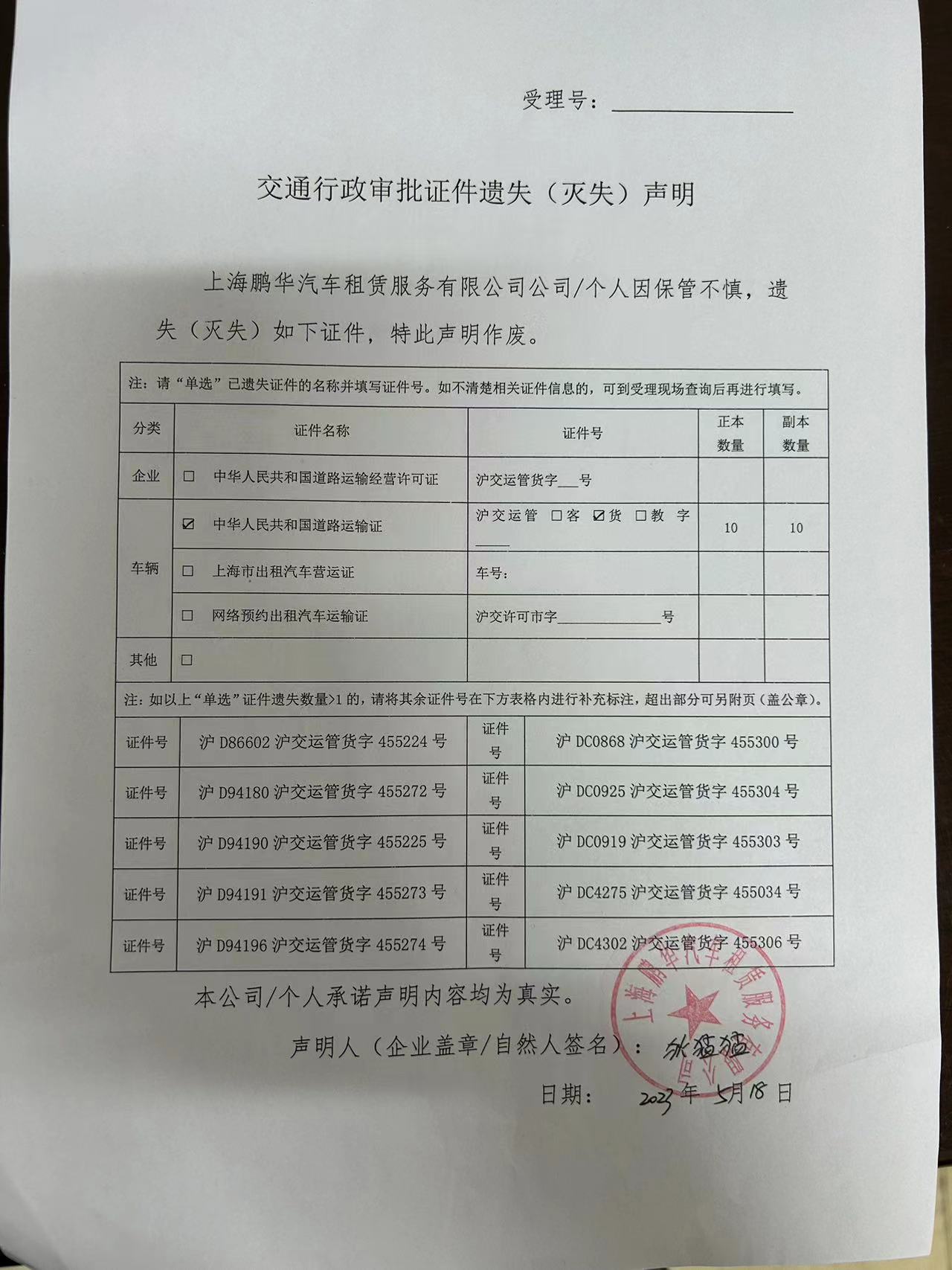 上海鹏华汽车租赁服务有限公司道路运输证遗失声明