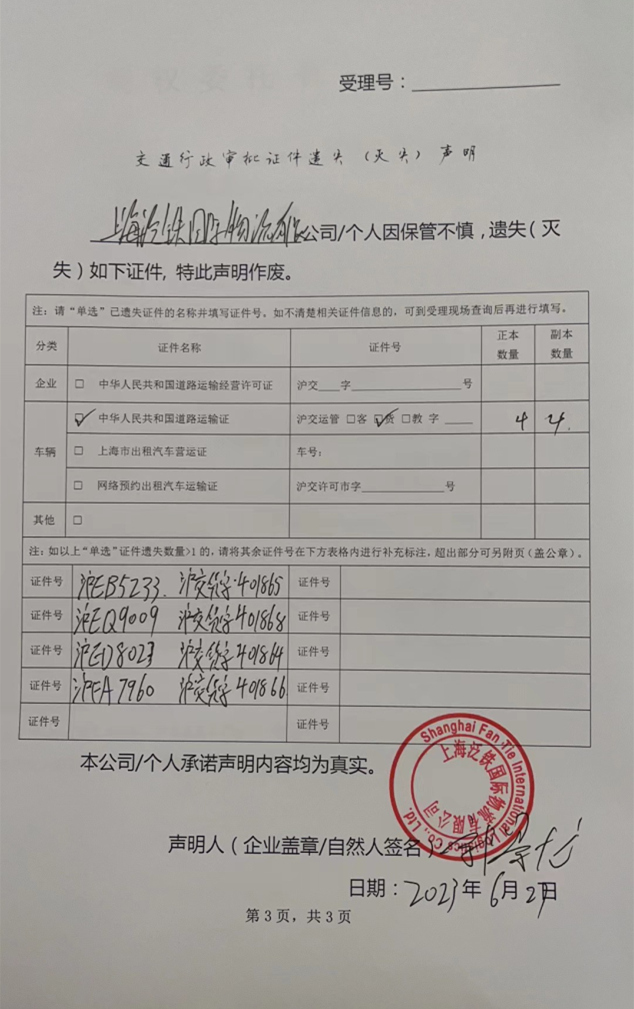 上海泛铁国际物流有限公司道路运输证(证件号:沪交运管货字401865等4本)遗失声明