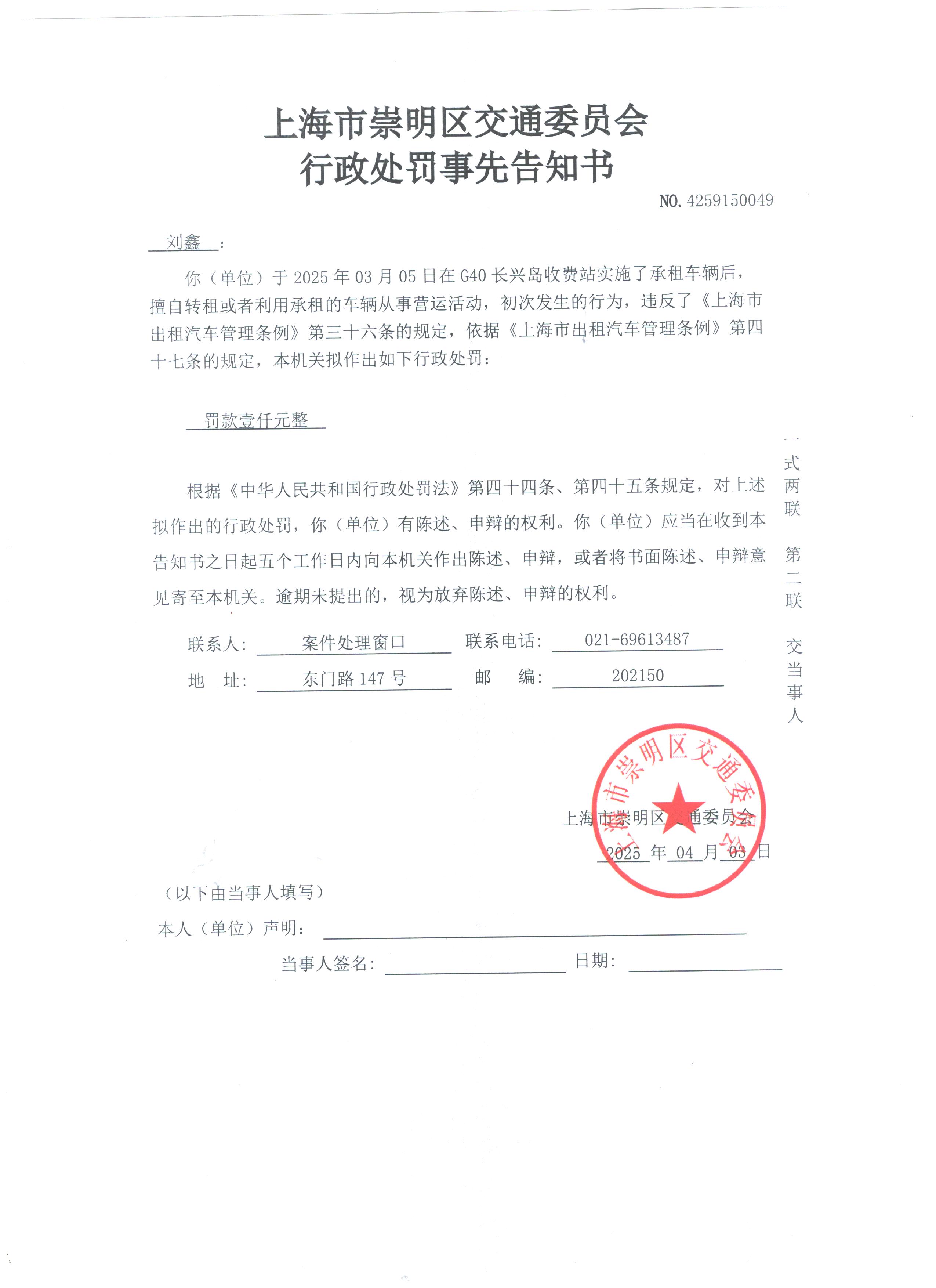 1 | 上海市崇明区交通委员会行政处罚事先告知书 | 4259150049 | 刘鑫 | 上海市松江区申新广场2号楼3层 |