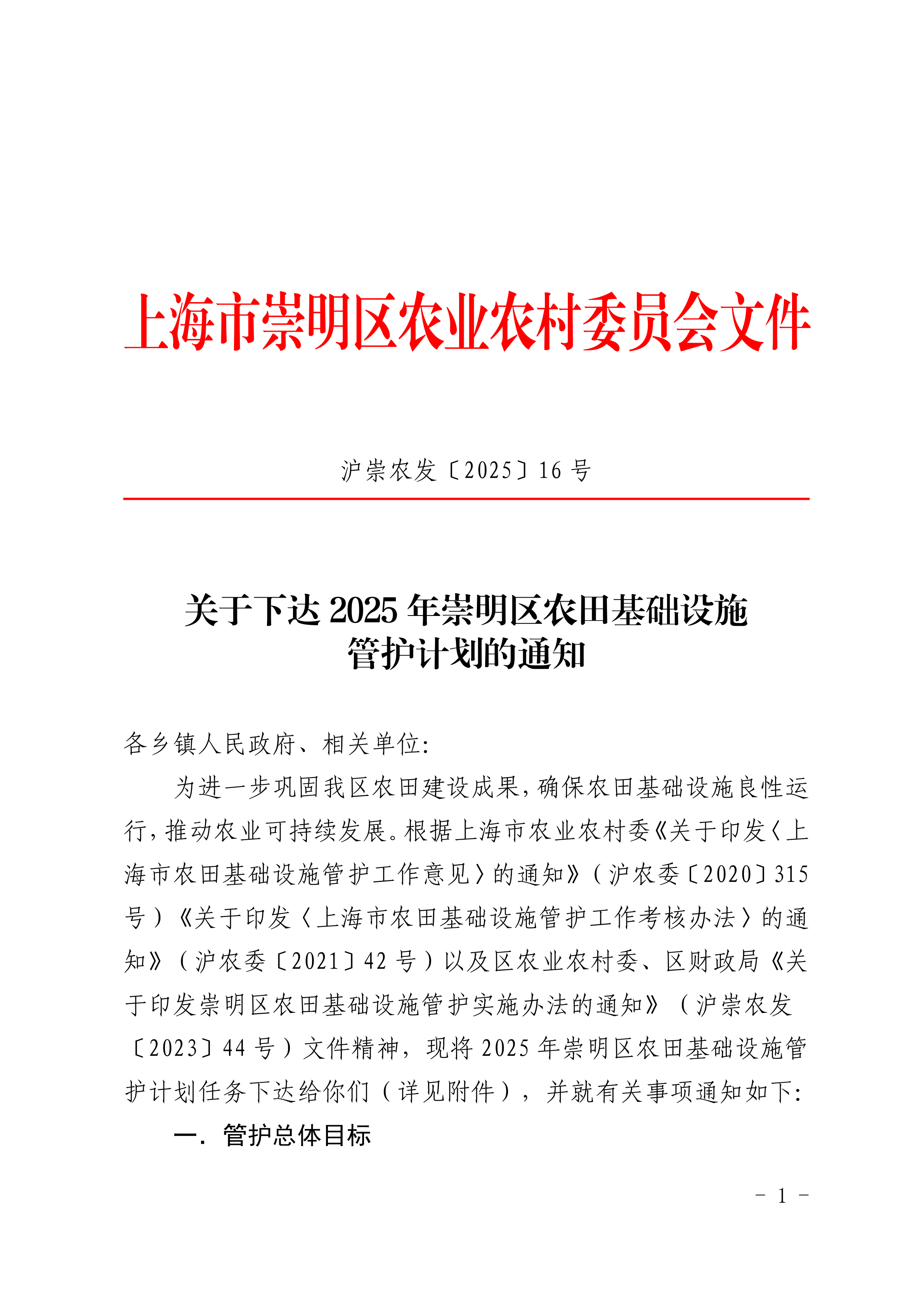 为进一步巩固我区农田建设成果,确保农田基础设施良性运行,推动农业可持续发展。根据上海市农业农村委《关于印发〈上海市农田基础设施管护工作意见〉的通知》(沪农委〔2020〕315号)《关于印发〈上海市农田基础设施管护工作考核办法〉的通知》(沪农委〔2021〕42号)以及区农业农村委、区财政局《关于印发崇明区农田基础设施管护实施办法的通知》(沪崇农发〔2023〕44号)文件精神,现将2025年崇明区农田基础设施管护计划任务下达给你们(详见附件),并就有关事项通知如下: