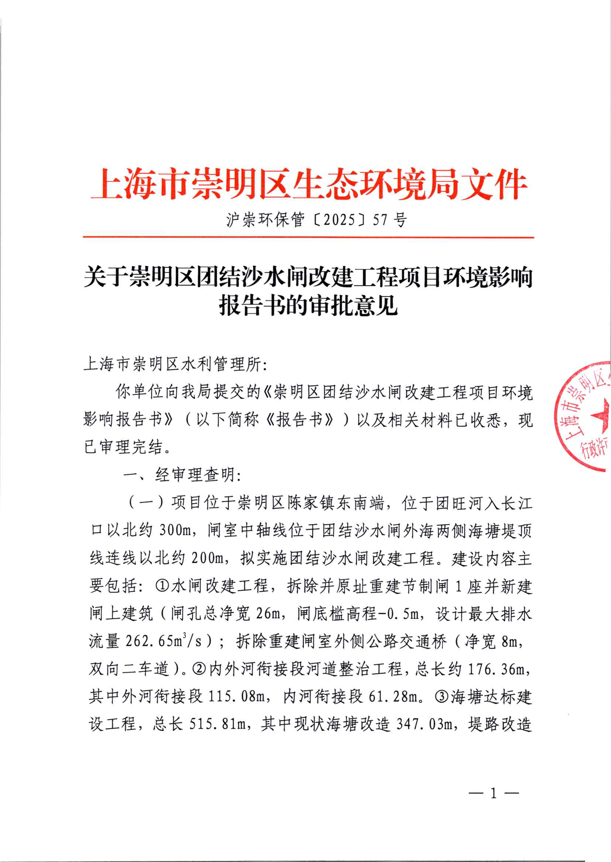 你单位向我局提交的《崇明区团结沙水闸改建工程项目环境影响报告书》(以下简称《报告书》)以及相关材料已收悉,现已审理完结。