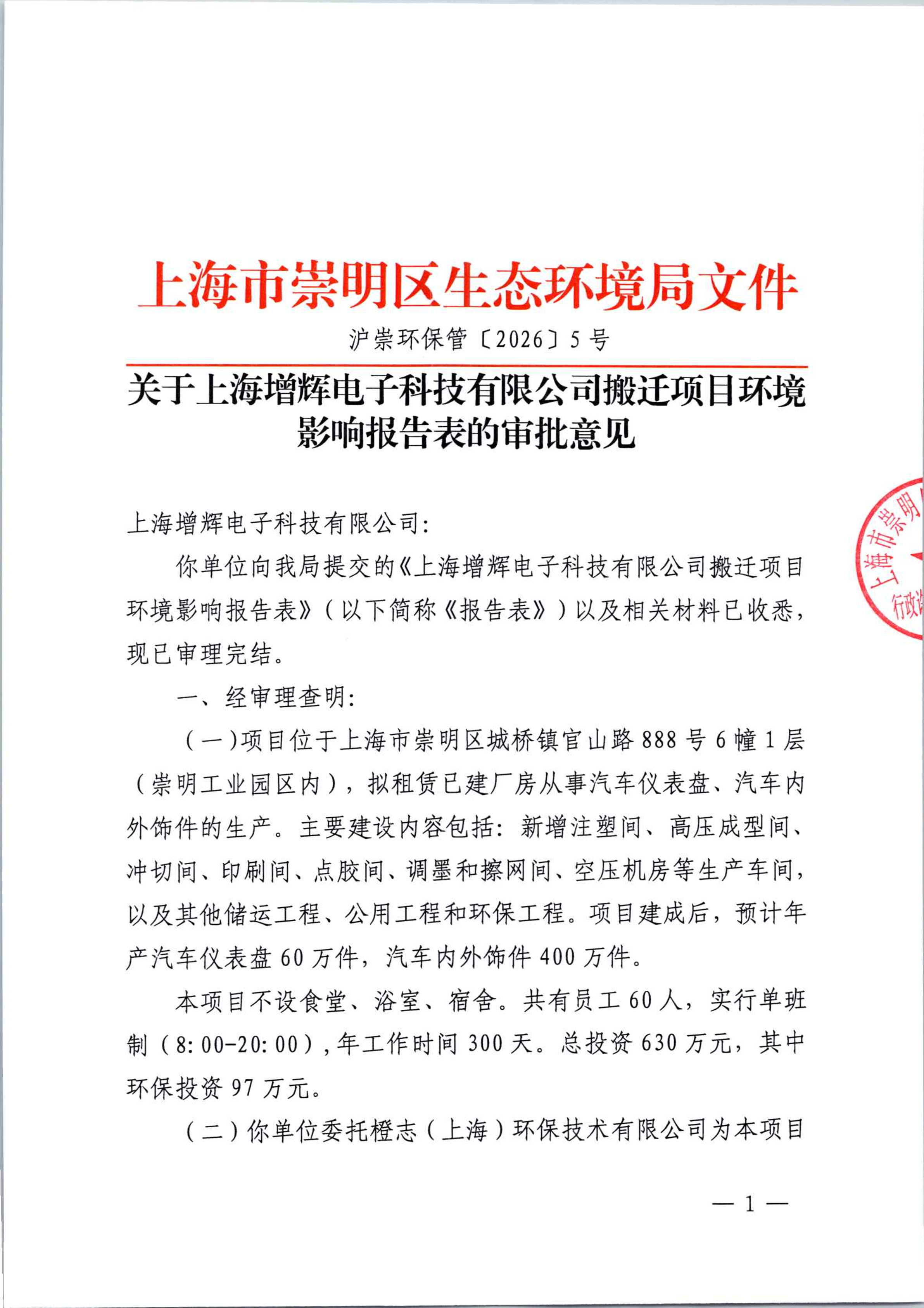你单位向我局提交的《上海增辉电子科技有限公司搬迁项目环境影响报告表》(以下简称《报告表》)以及相关材料已收悉,现已审理完结。