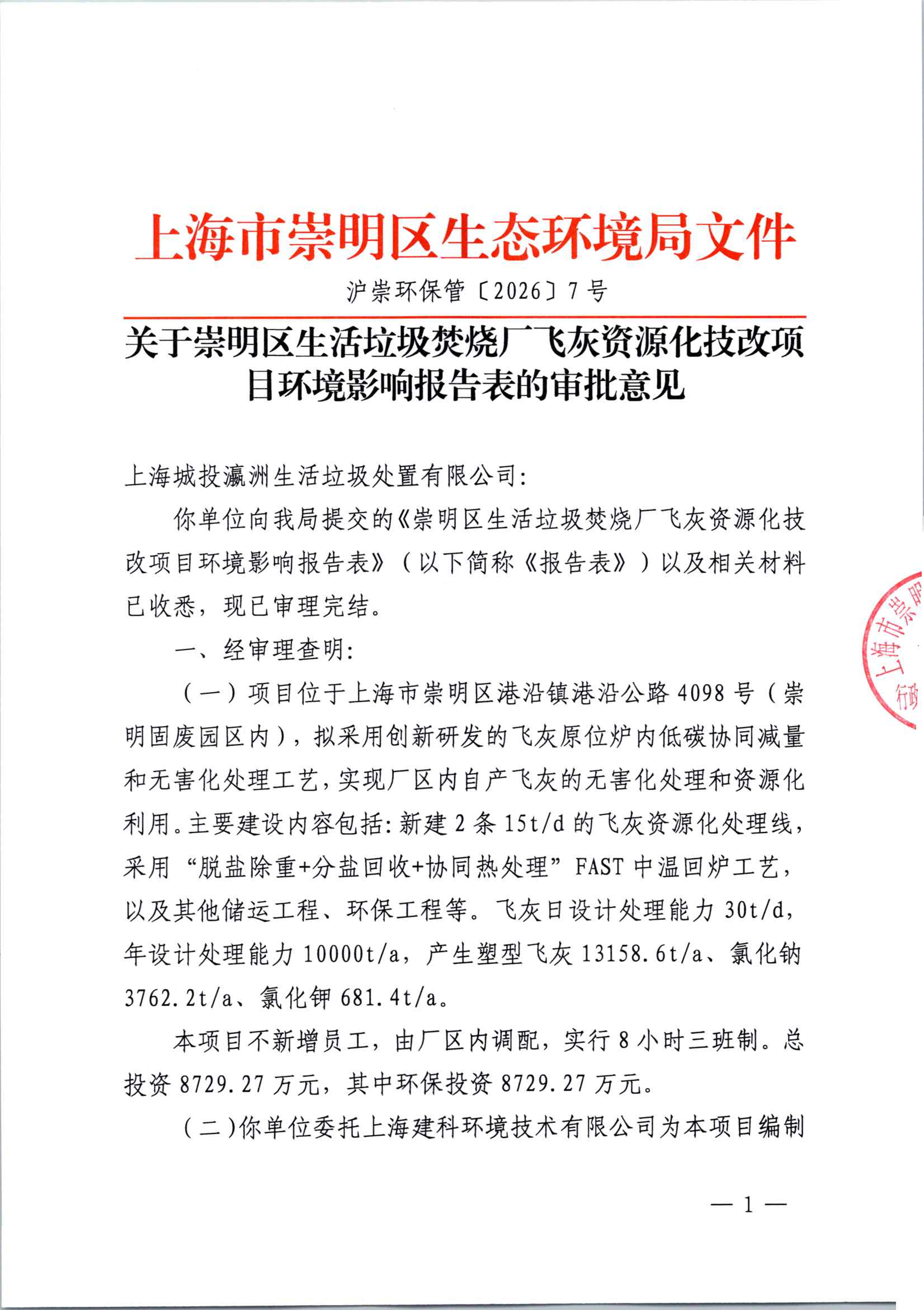 你单位向我局提交的《崇明区生活垃圾焚烧厂飞灰资源化技改项目环境影响报告表》(以下简称《报告表》)以及相关材料已收悉,现已审理完结。