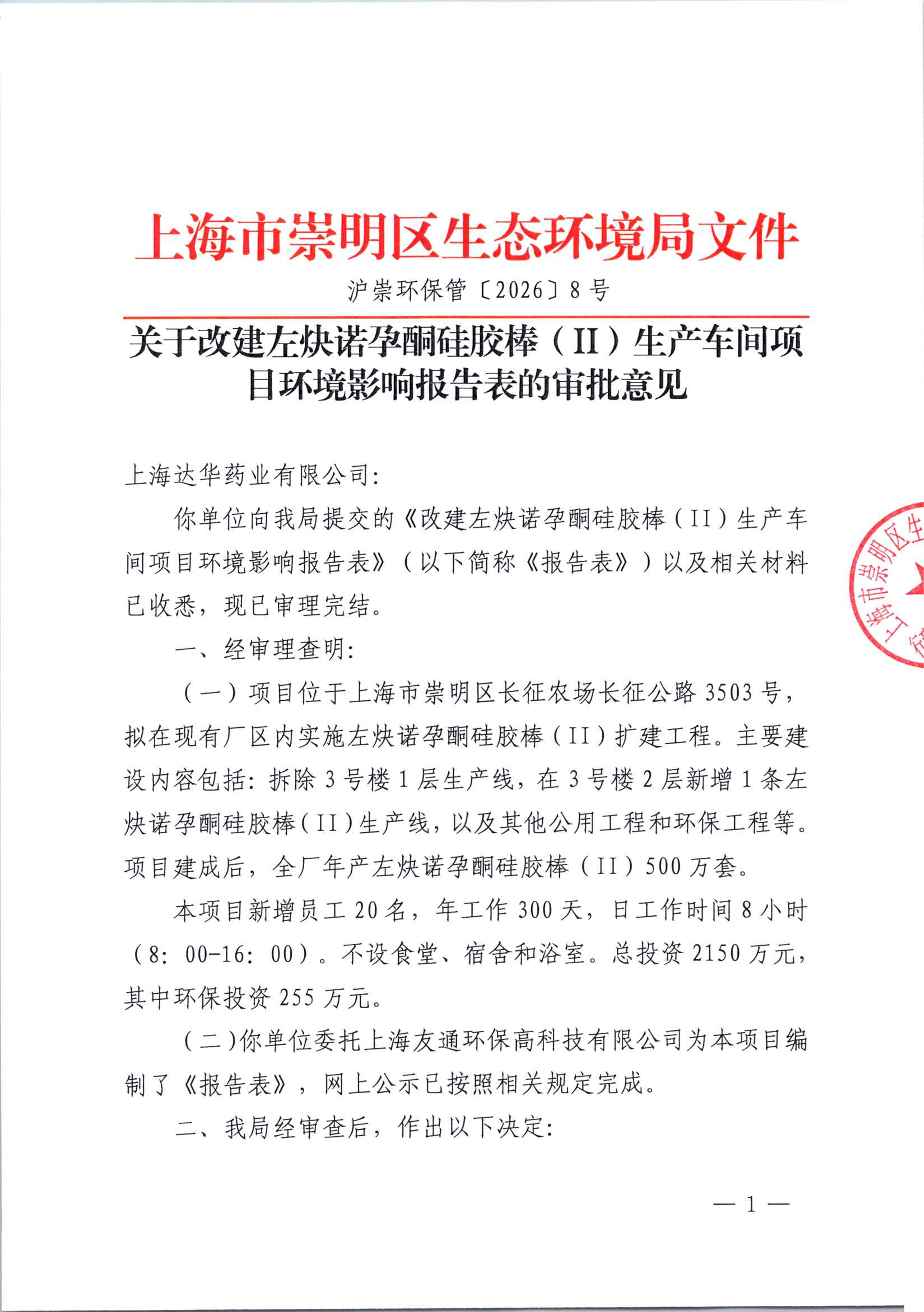 (一)项目位于上海市崇明区长征农场长征公路3503号,拟在现有厂区内实施左炔诺孕酮硅胶棒(II)扩建工程。主要建设内容包括:拆除3号楼1层生产线,在3号楼2层新增1条左炔诺孕酮硅胶棒(II)生产线,以及其他公用工程和环保工程等。项目建成后,全厂年产左炔诺孕酮硅胶棒(II)500万套。