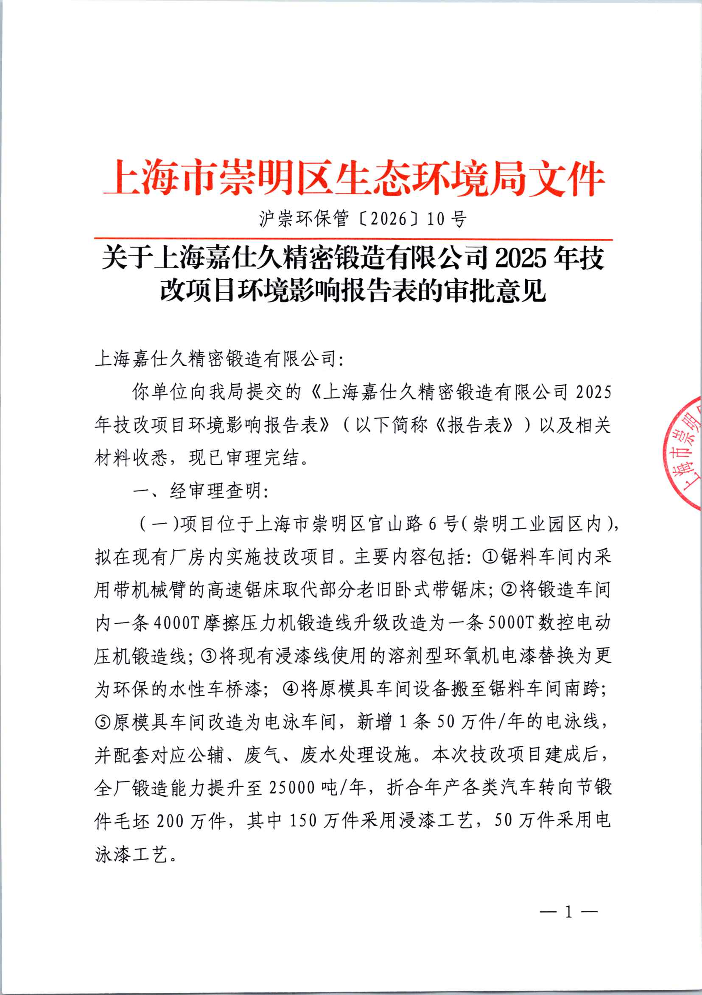 你单位向我局提交的《上海嘉仕久精密锻造有限公司2025年技改项目环境影响报告表》(以下简称《报告表》)以及相关材料收悉,现已审理完结。