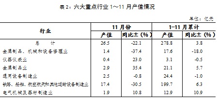 11月份,崇明六大重点行业呈现“三增三减”态势。六大重点行业实现工业总产值26.5亿元,同比下降22.1%。值得注意的是,在六大重点行业中,铁路、船舶、航空航天和其他运输设备制造业一直起到支柱作用,决定着六大重点行业乃至全区工业生产的整体水平,但11月份该行业表现不佳,仅实现产值17.4亿元,同比下降30.5%,降幅较深,需要引起相关部门重视。1~11月,六大重点行业累计实现总产值278.8亿元,同比增长3.8%。