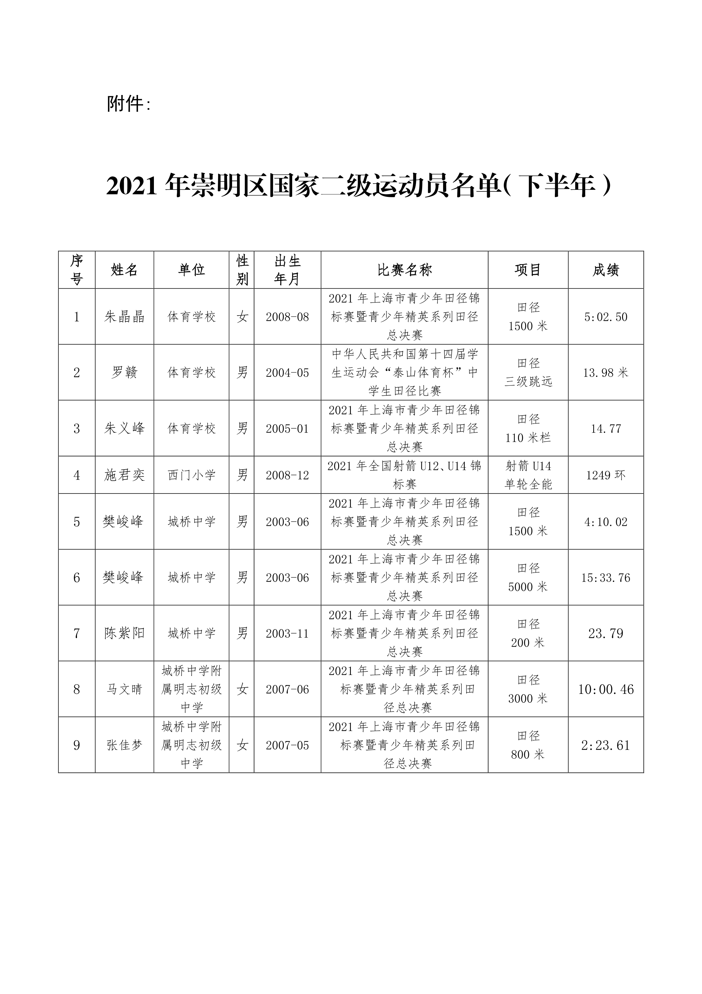 根据《体育总局关于印发<运动员技术等级标准>的通知》(体竞字〔2021〕131号),(沪体函〔2021〕17号)文件精神,经网上公示,现批准朱晶晶、罗赣等9名为国家二级运动员,无异批准时间为2021年12月17日。