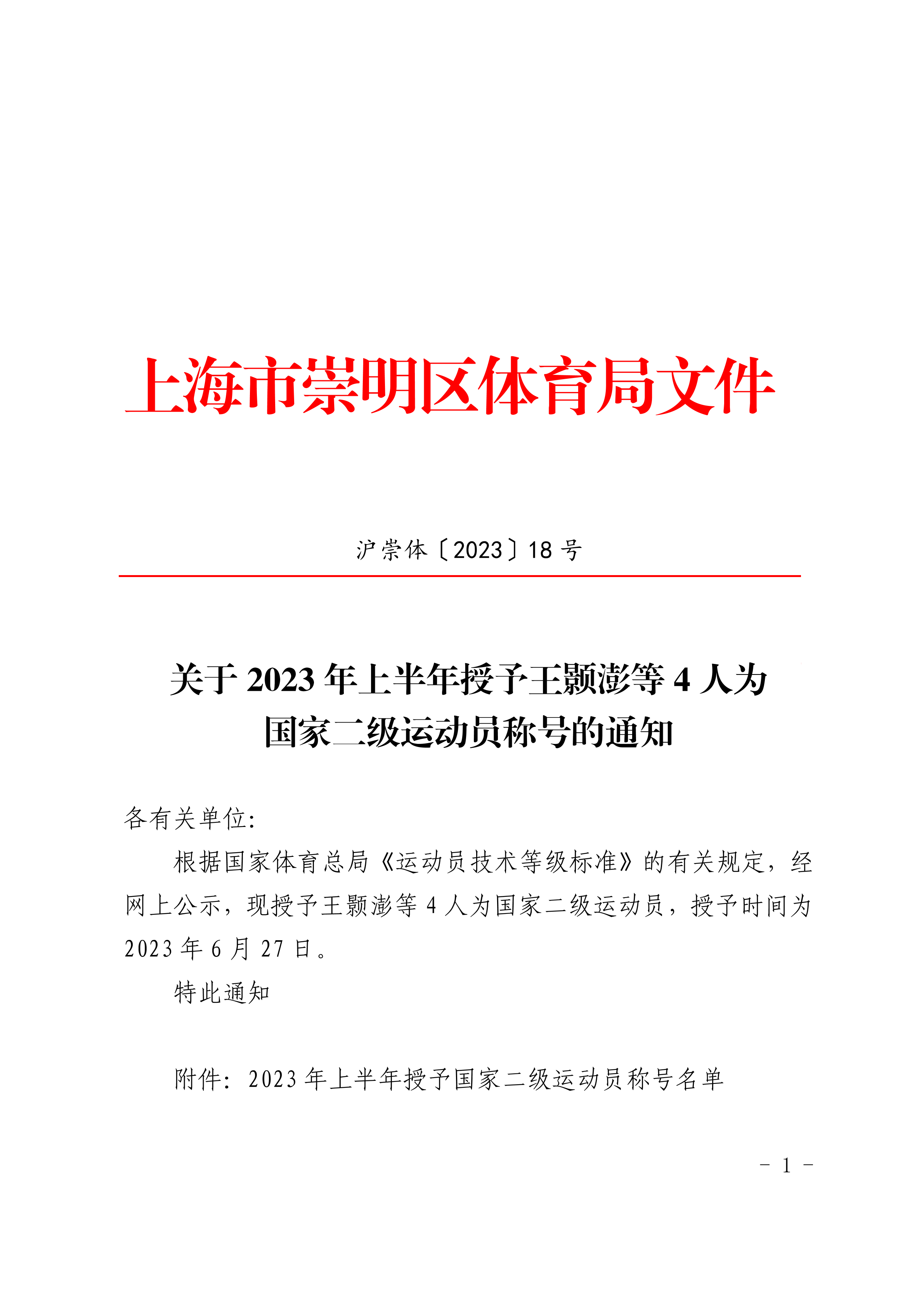根据国家体育总局《运动员技术等级标准》的有关规定,经网上公示,现授予王颢澎等4人为国家二级运动员,授予时间为2023年6月27日。