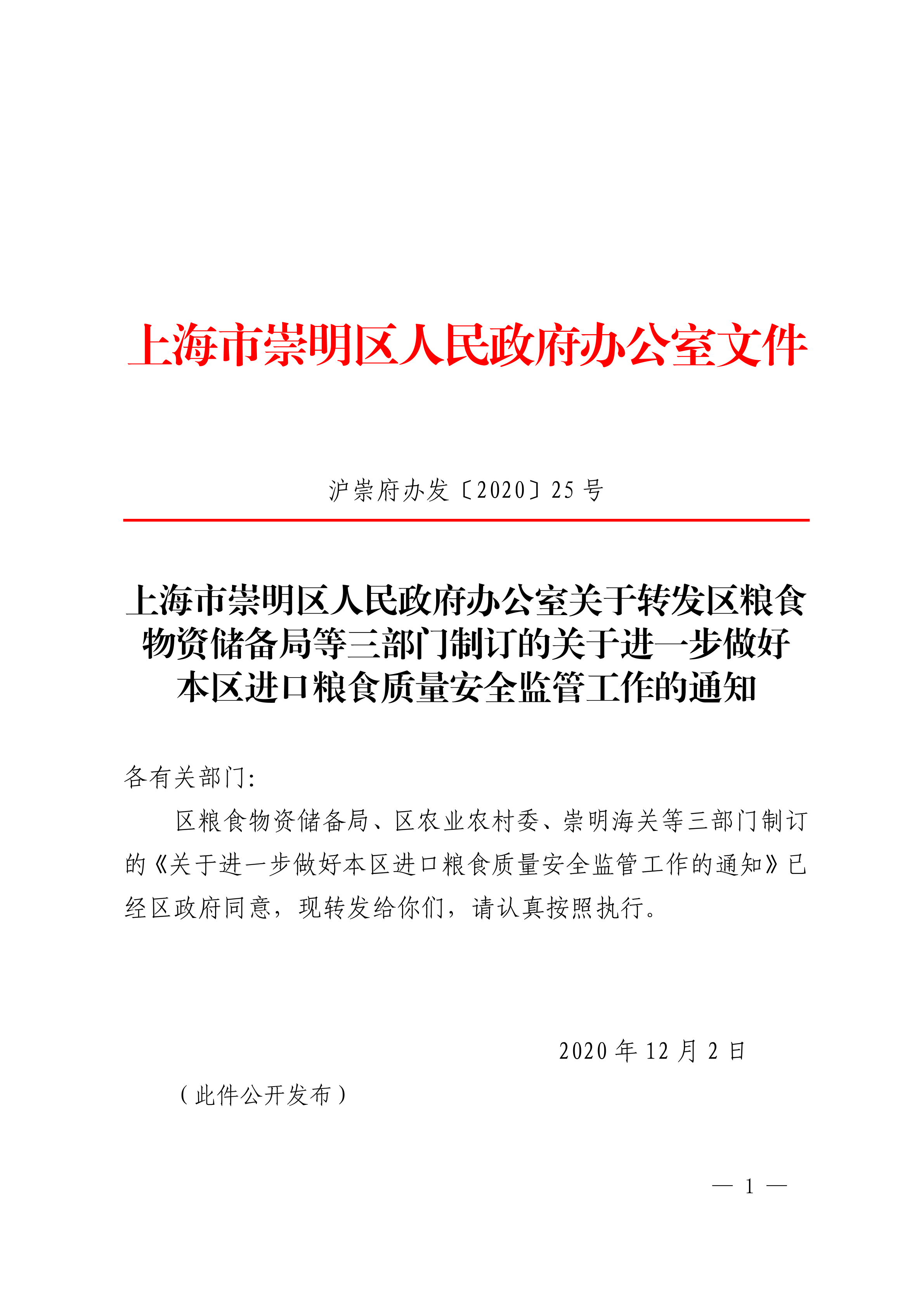区粮食物资储备局、区农业农村委、崇明海关等三部门制订的《关于进一步做好本区进口粮食质量安全监管工作的通知》已经区政府同意,现转发给你们,请认真按照执行。