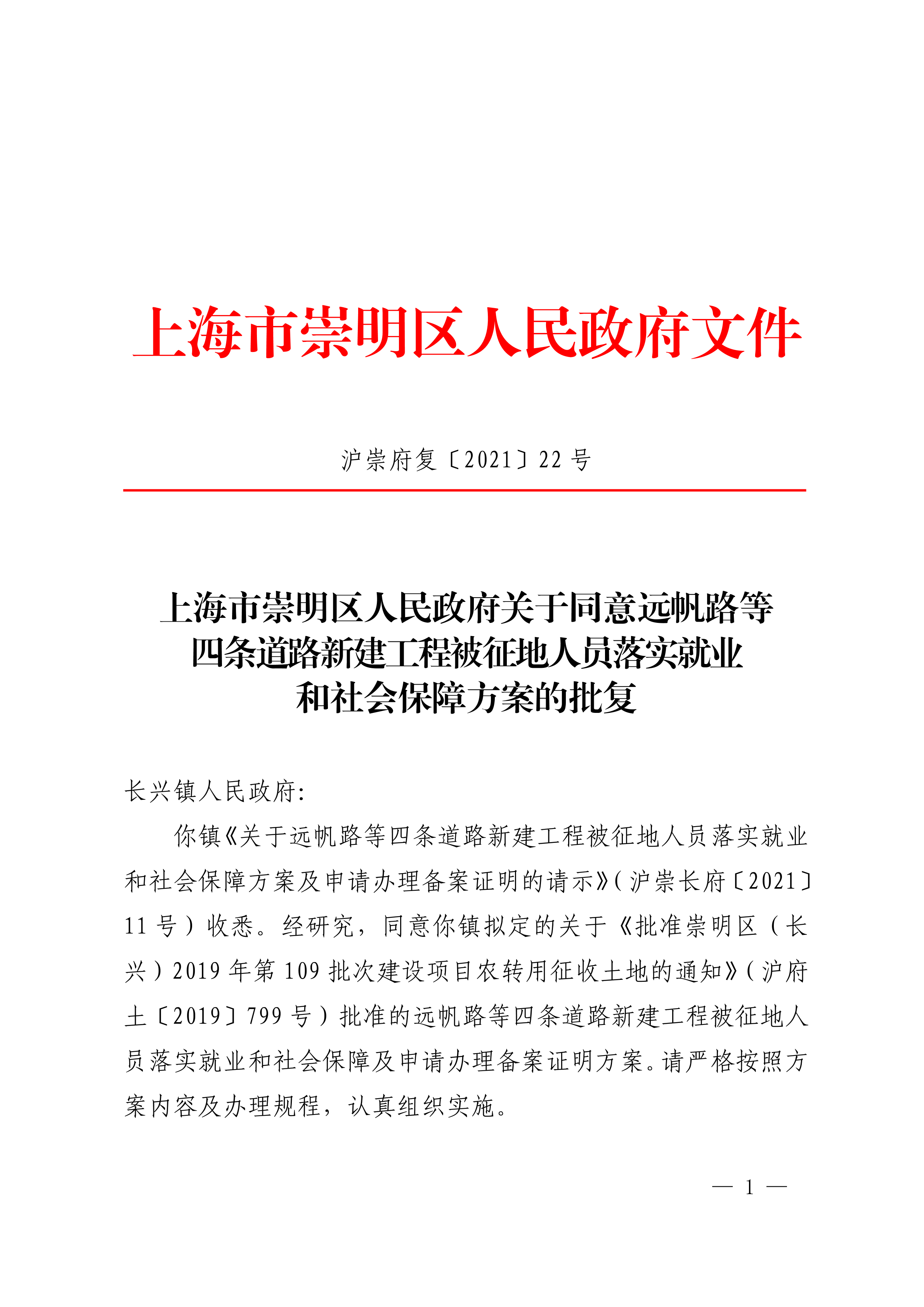 你镇《关于远帆路等四条道路新建工程被征地人员落实就业和社会保障方案及申请办理备案证明的请示》(沪崇长府〔2021〕11号)收悉。经研究,同意你镇拟定的关于《批准崇明区(长兴)2019年第109批次建设项目农转用征收土地的通知》(沪府土〔2019〕799号)批准的远帆路等四条道路新建工程被征地人员落实就业和社会保障及申请办理备案证明方案。请严格按照方案内容及办理规程,认真组织实施。