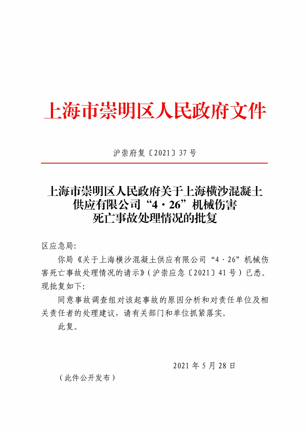你局《关于上海横沙混凝土供应有限公司“4·26”机械伤害死亡事故处理情况的请示》(沪崇应急〔2021〕41号)已悉。现批复如下: