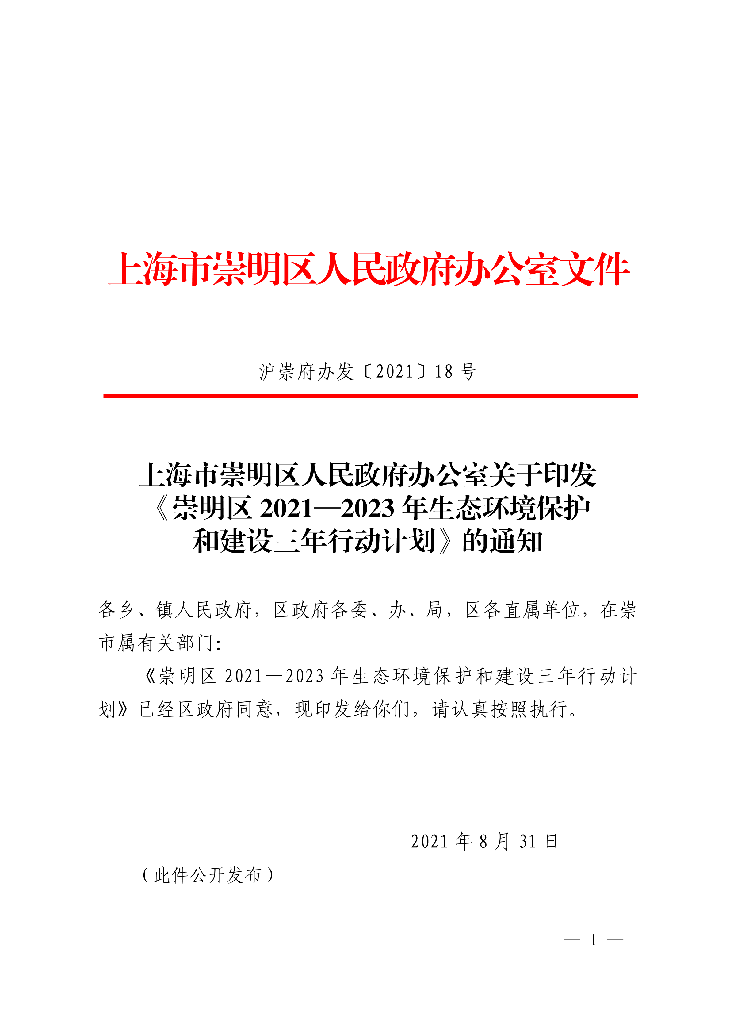 《崇明区2021—2023年生态环境保护和建设三年行动计划》已经区政府同意,现印发给你们,请认真按照执行。