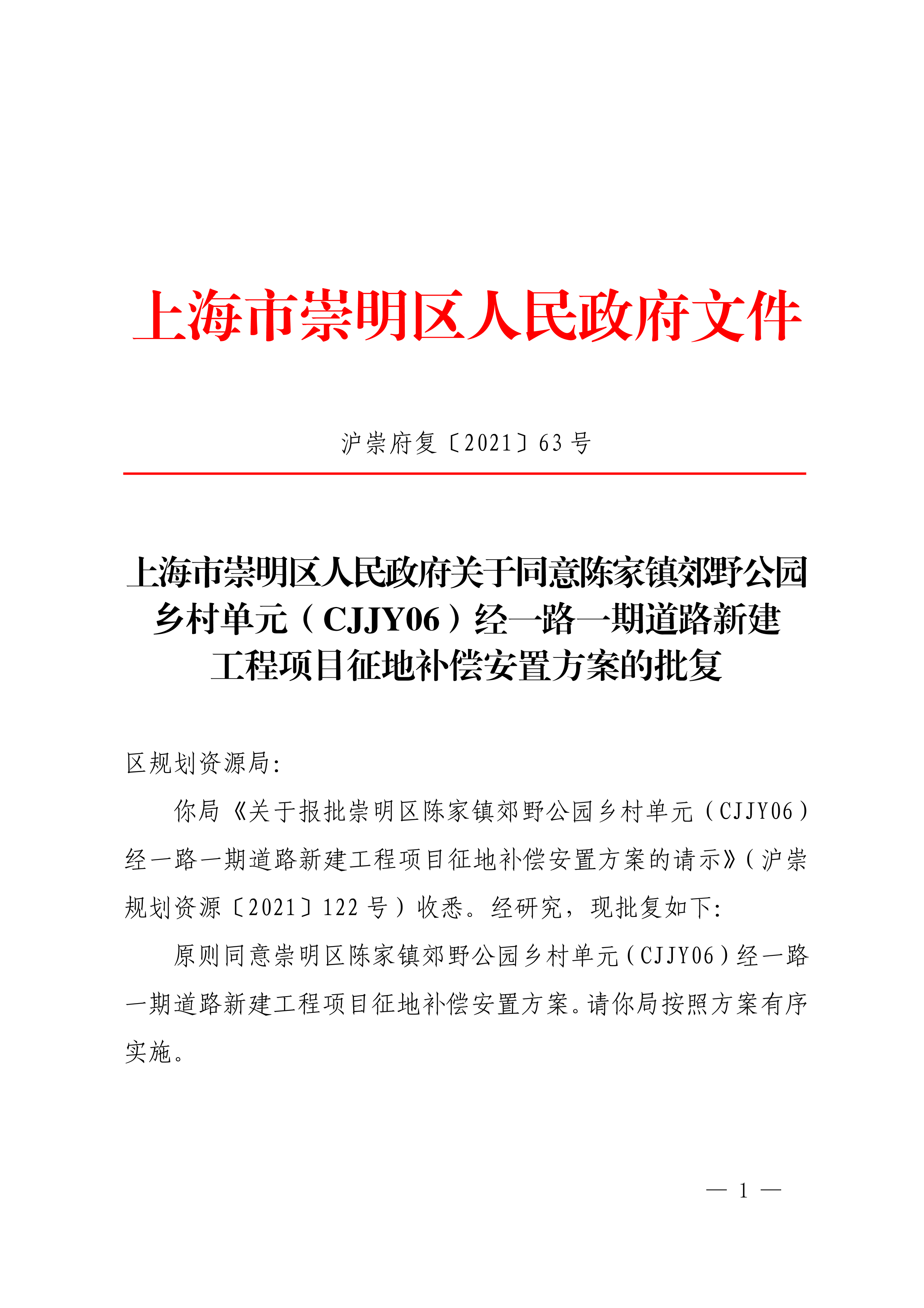 你局《关于报批崇明区陈家镇郊野公园乡村单元(CJJY06)经一路一期道路新建工程项目征地补偿安置方案的请示》(沪崇规划资源〔2021〕122号)收悉。经研究,现批复如下: