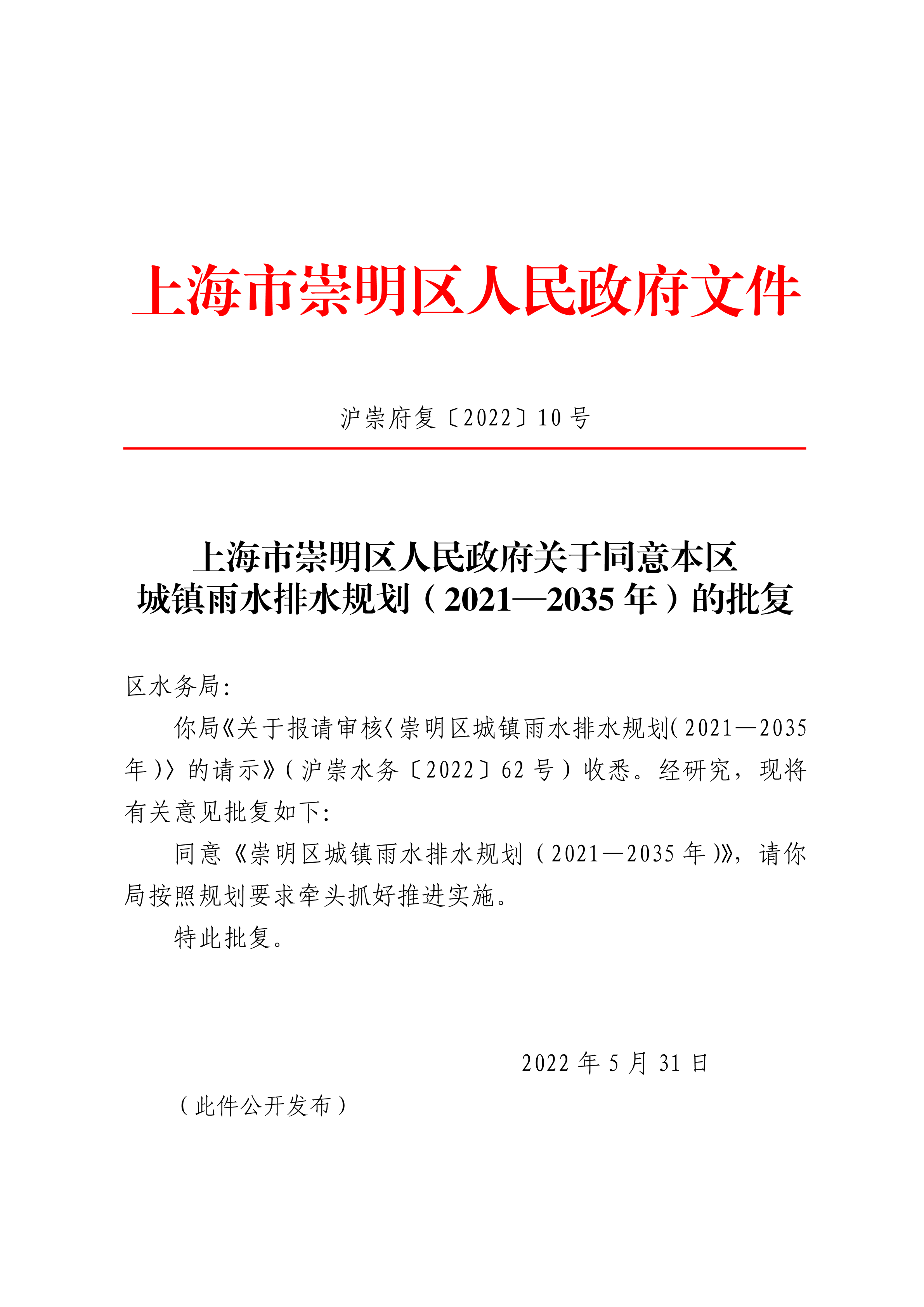 同意《崇明区城镇雨水排水规划(2021—2035年)》,请你局按照规划要求牵头抓好推进实施。