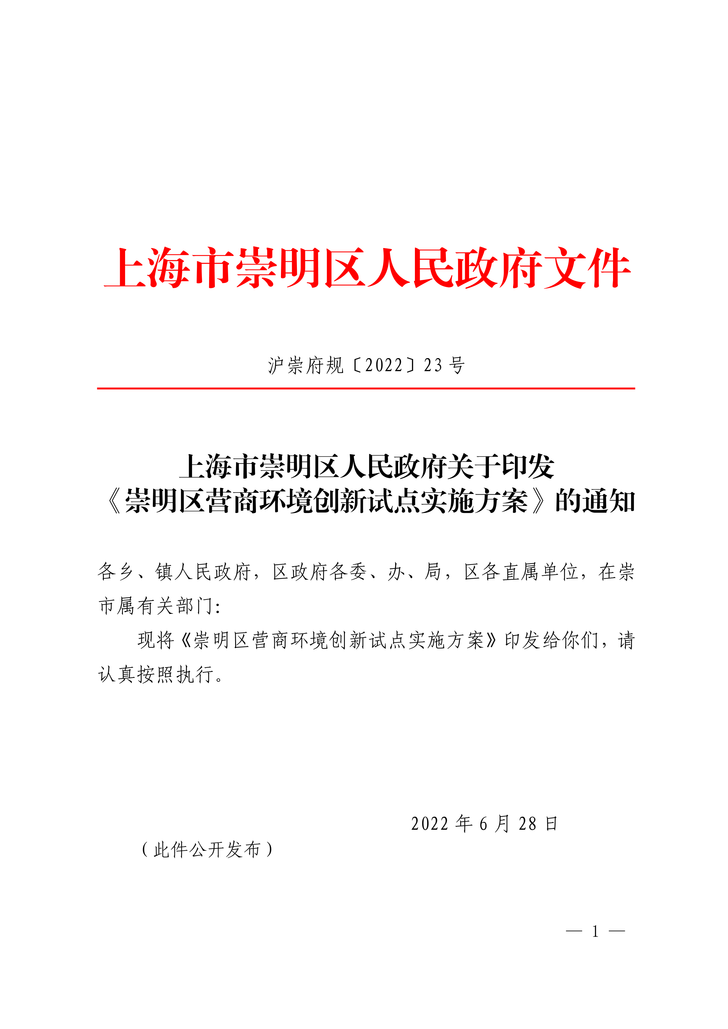 现将《崇明区营商环境创新试点实施方案》印发给你们,请认真按照执行。