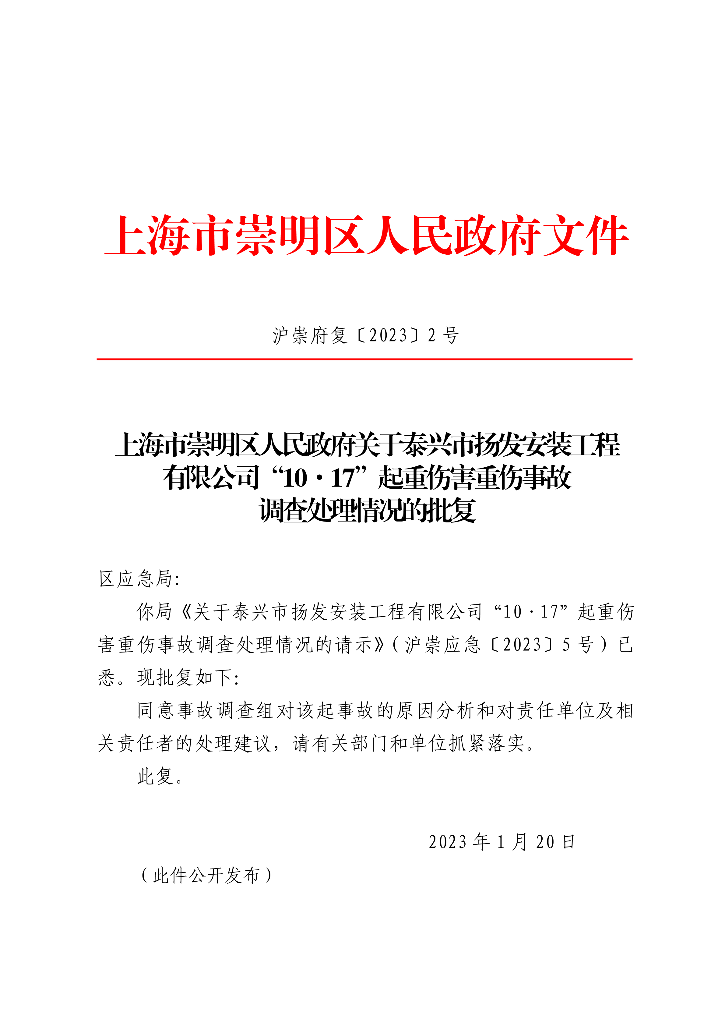 你局《关于泰兴市扬发安装工程有限公司“10·17”起重伤害重伤事故调查处理情况的请示》(沪崇应急〔2023〕5号)已悉。现批复如下: