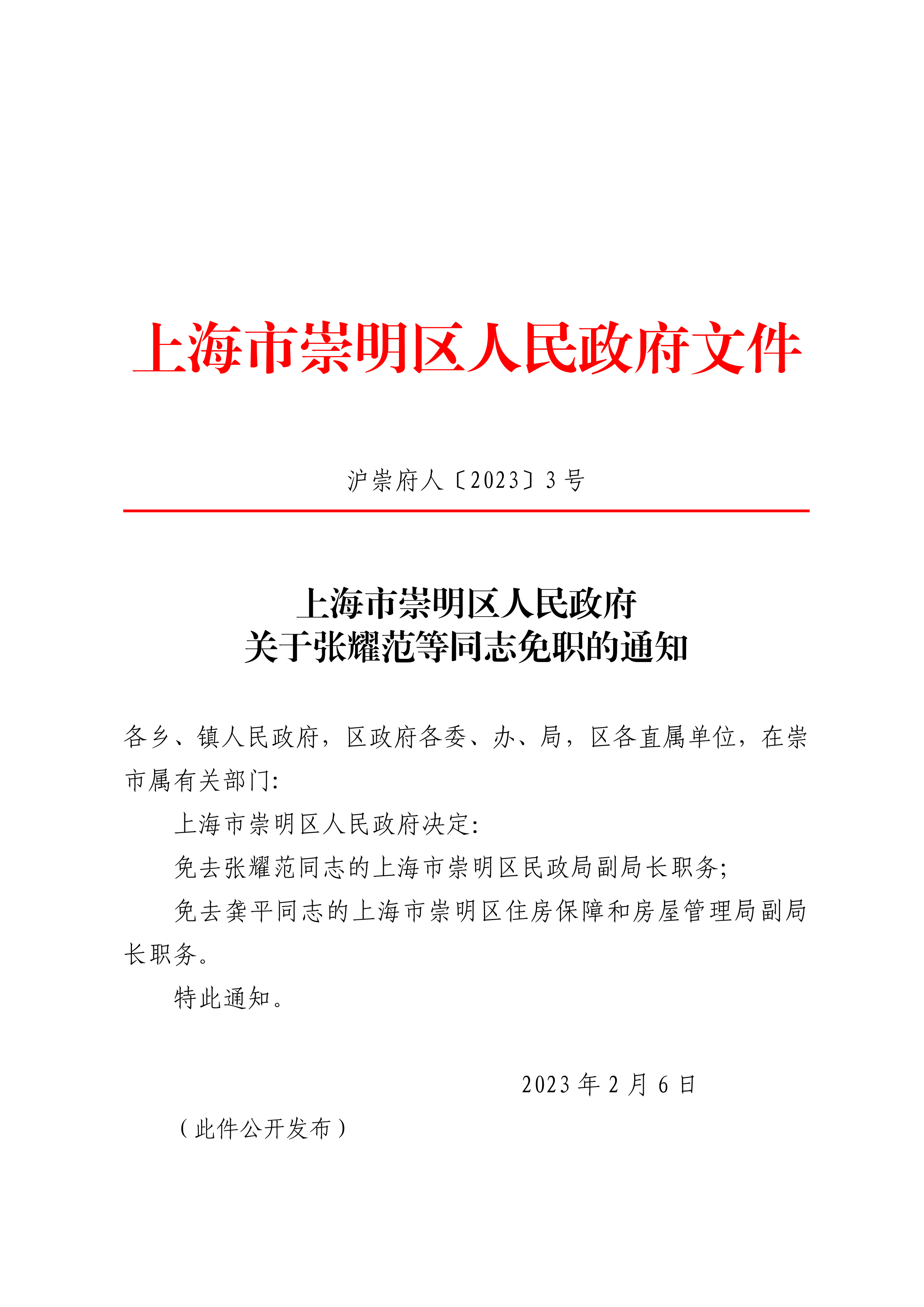 免去张耀范同志的上海市崇明区民政局副局长职务;