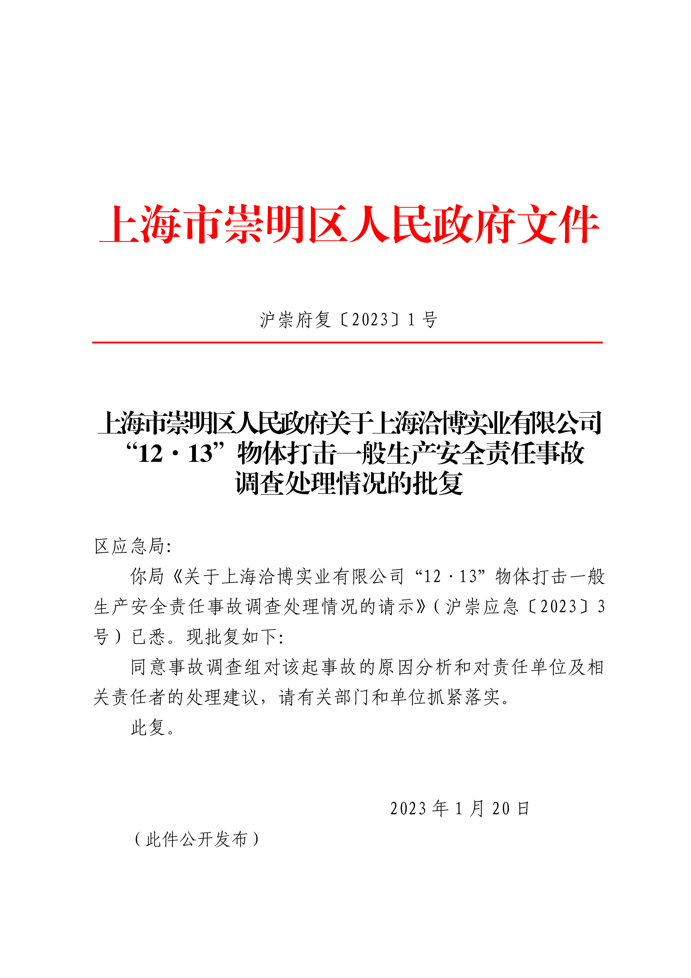 你局《关于上海洽博实业有限公司“12·13”物体打击一般生产安全责任事故调查处理情况的请示》(沪崇应急〔2023〕3号)已悉。现批复如下: