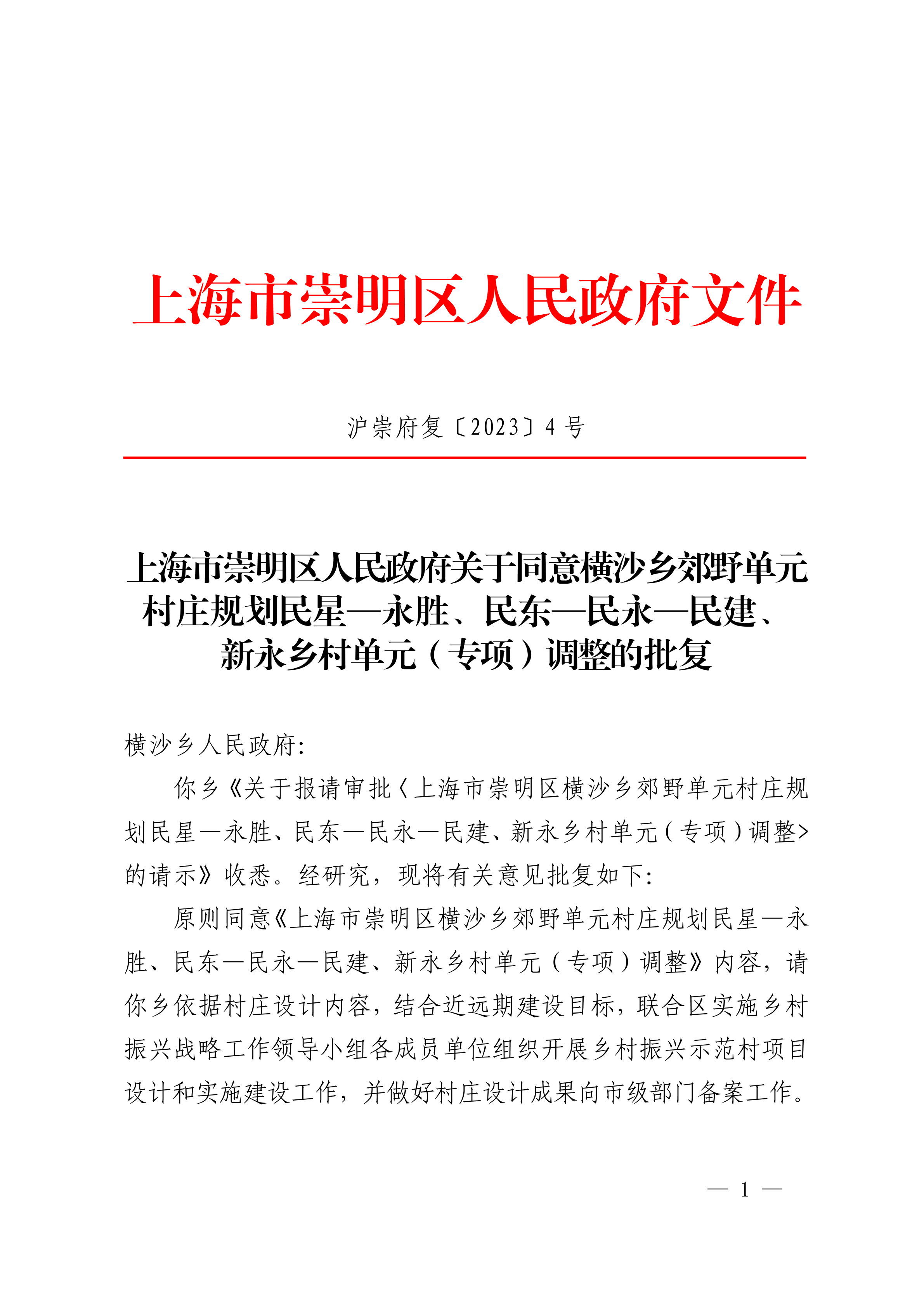 你乡《关于报请审批〈上海市崇明区横沙乡郊野单元村庄规划民星—永胜、民东—民永—民建、新永乡村单元(专项)调整>的请示》收悉。经研究,现将有关意见批复如下: