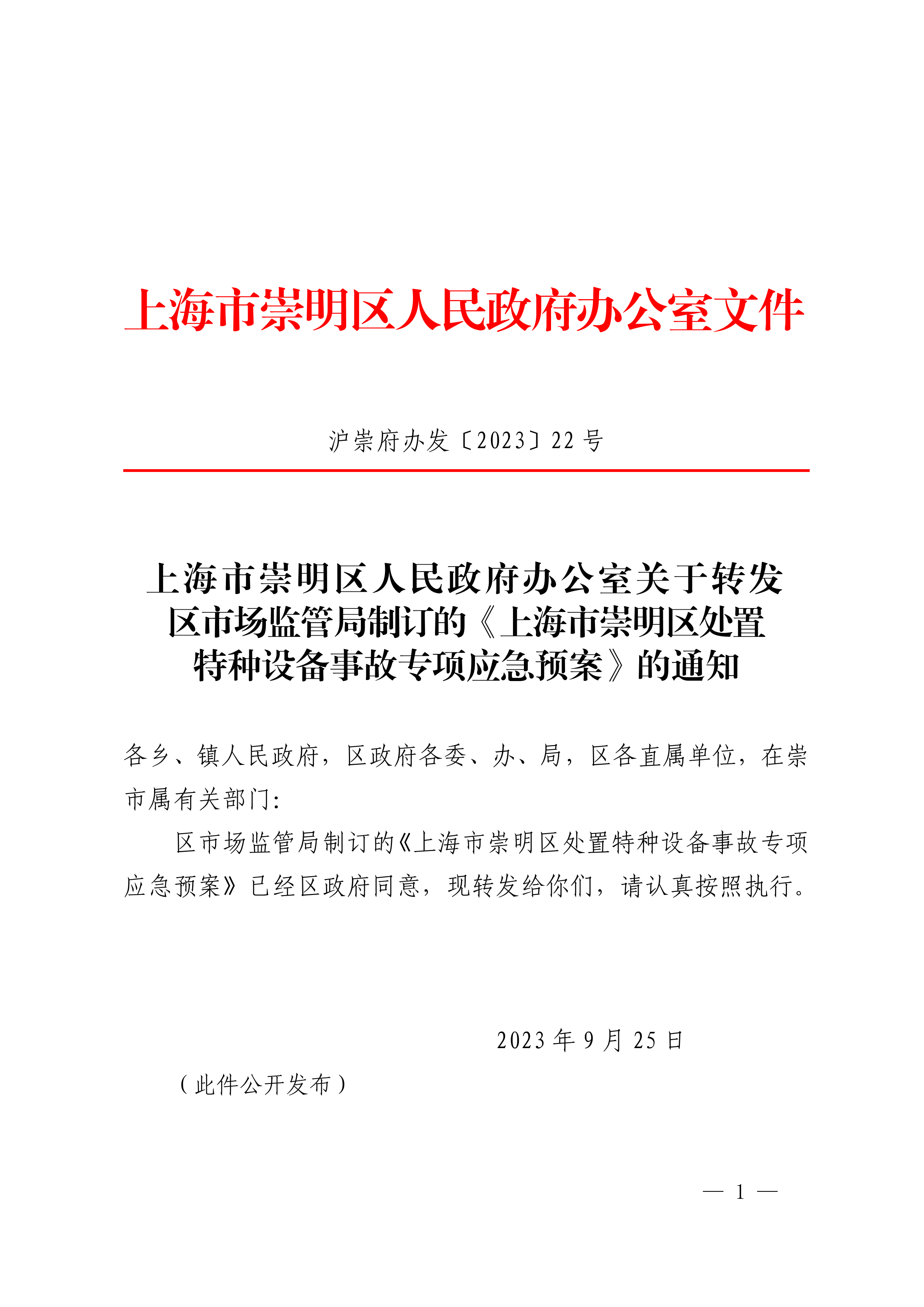 区市场监管局制订的《上海市崇明区处置特种设备事故专项应急预案》已经区政府同意,现转发给你们,请认真按照执行。