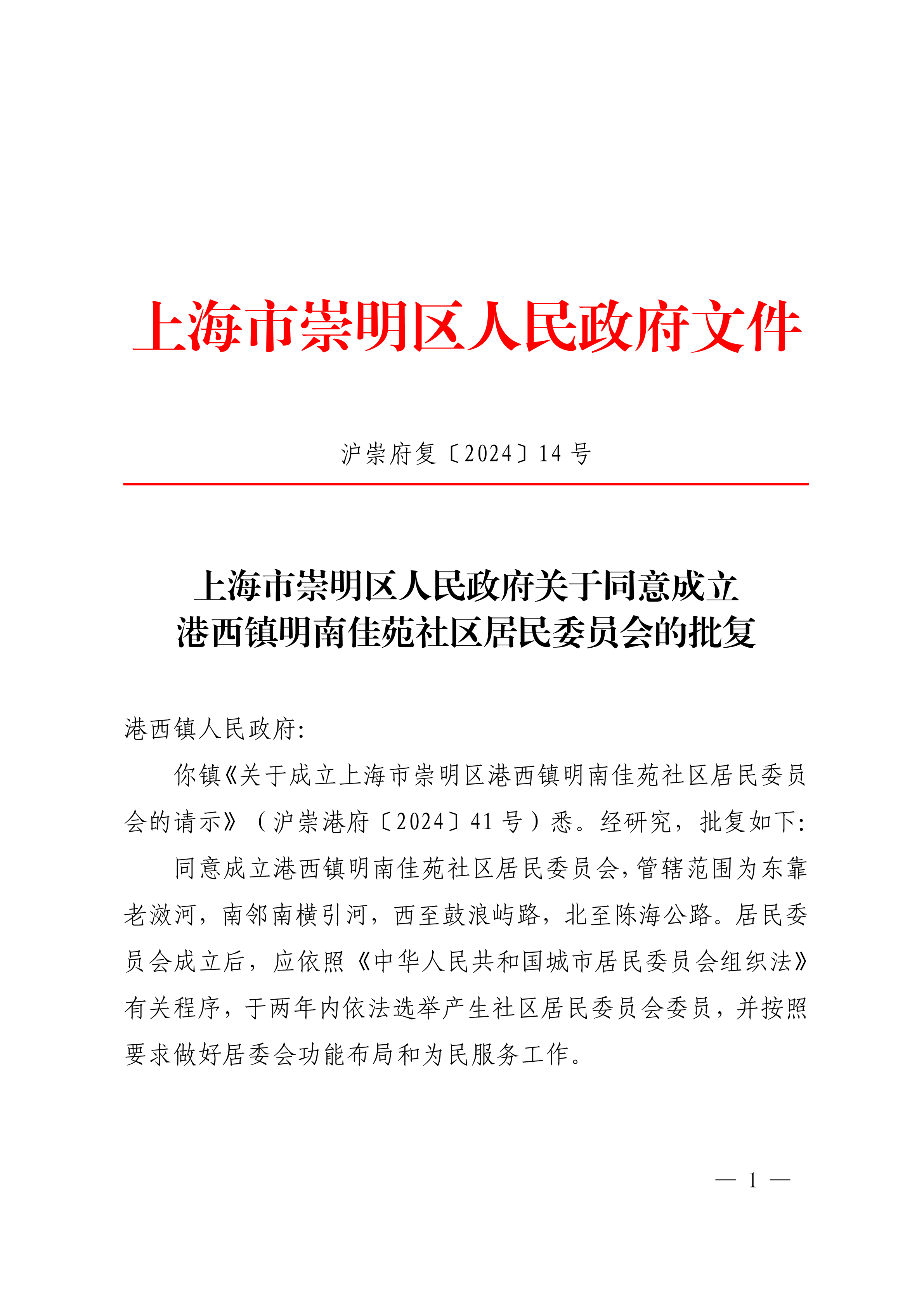 你镇《关于成立上海市崇明区港西镇明南佳苑社区居民委员会的请示》(沪崇港府〔2024〕41号)悉。经研究,批复如下: