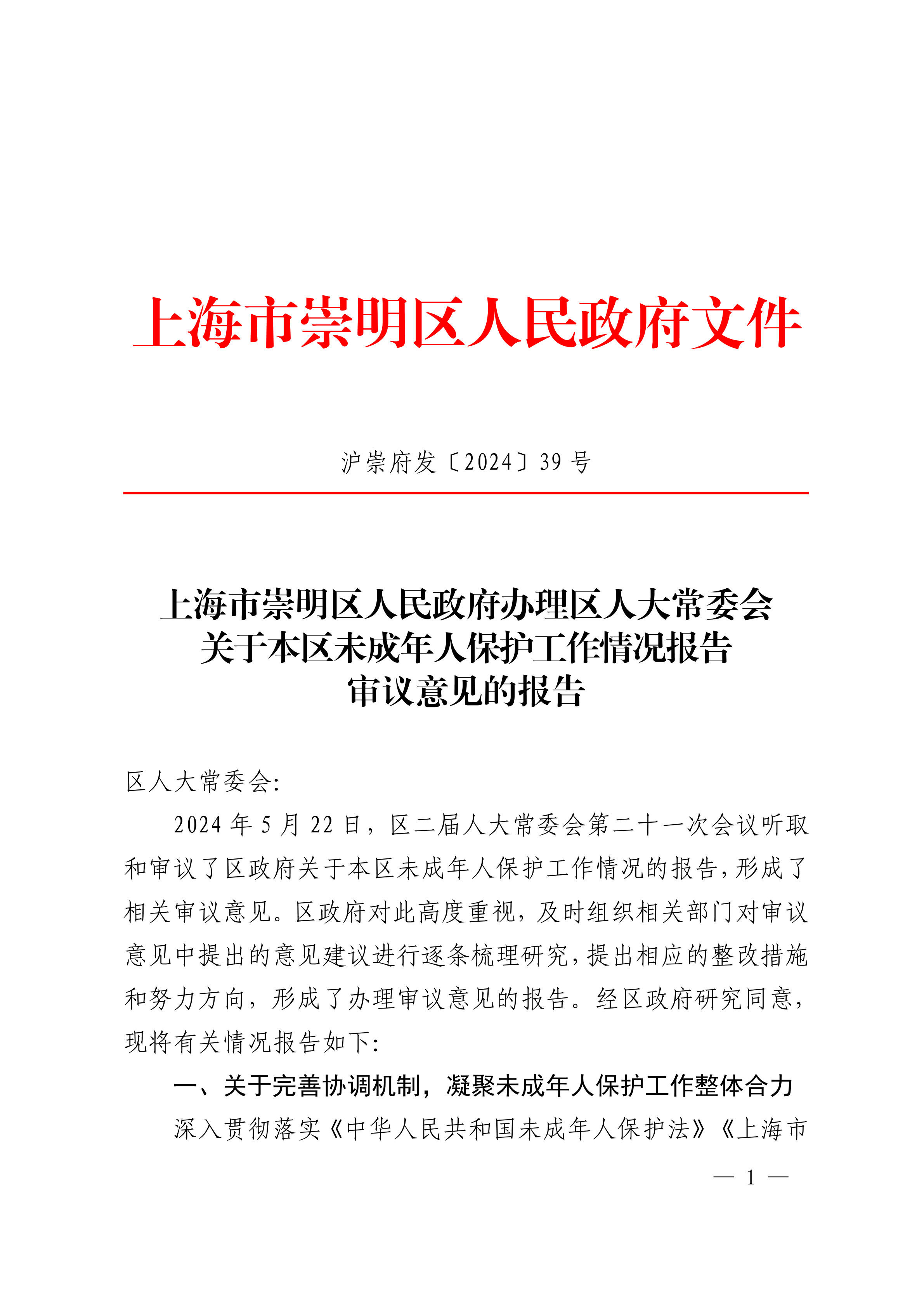 2024年5月22日,区二届人大常委会第二十一次会议听取和审议了区政府关于本区未成年人保护工作情况的报告,形成了相关审议意见。区政府对此高度重视,及时组织相关部门对审议意见中提出的意见建议进行逐条梳理研究,提出相应的整改措施和努力方向,形成了办理审议意见的报告。经区政府研究同意,现将有关情况报告如下: