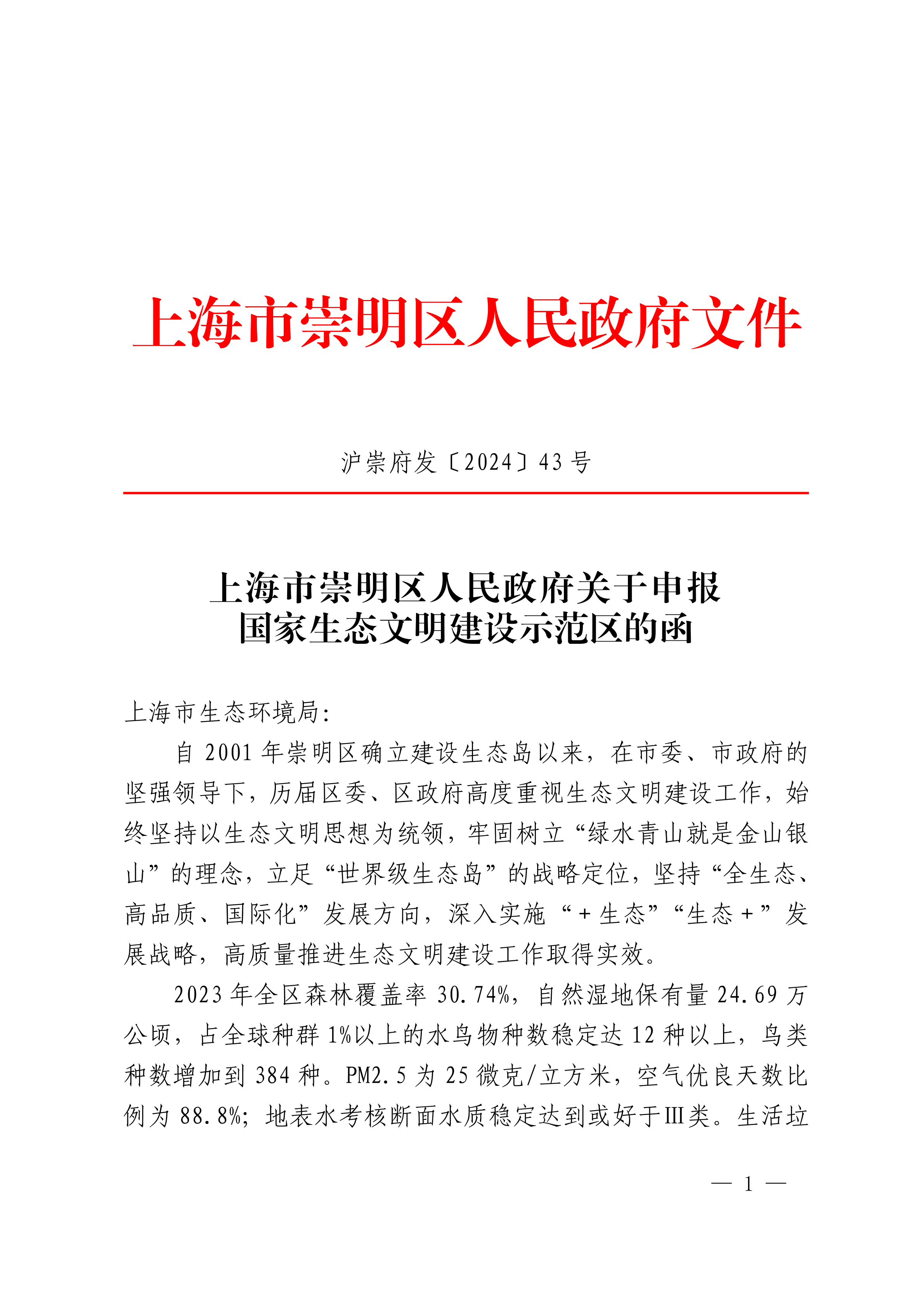 按照《关于印发<生态文明建设示范区(市)建设指标><生态文明建设示范区(县)建设指标><生态文明建设示范区管理规程><“绿水青山就是金山银山”实践创新基地建设管理规程>的通知》(环办生态〔2024〕4号)、《关于印发<上海市创建国家生态文明建设示范区、“绿水青山就是金山银山”实践创新基地管理办法(试行)>的通知》(沪生建办〔2024〕4号)等文件要求,经自查,我区已具备国家生态文明建设示范区创建条件,不存在《生态文明建设示范区管理规程》第十五条规定的不得申报情形,且各项指标均达到或优于创建要求。现提出申请,恳请市生态环境局支持我区创建国家生态文明建设示范区,并向上级推荐。