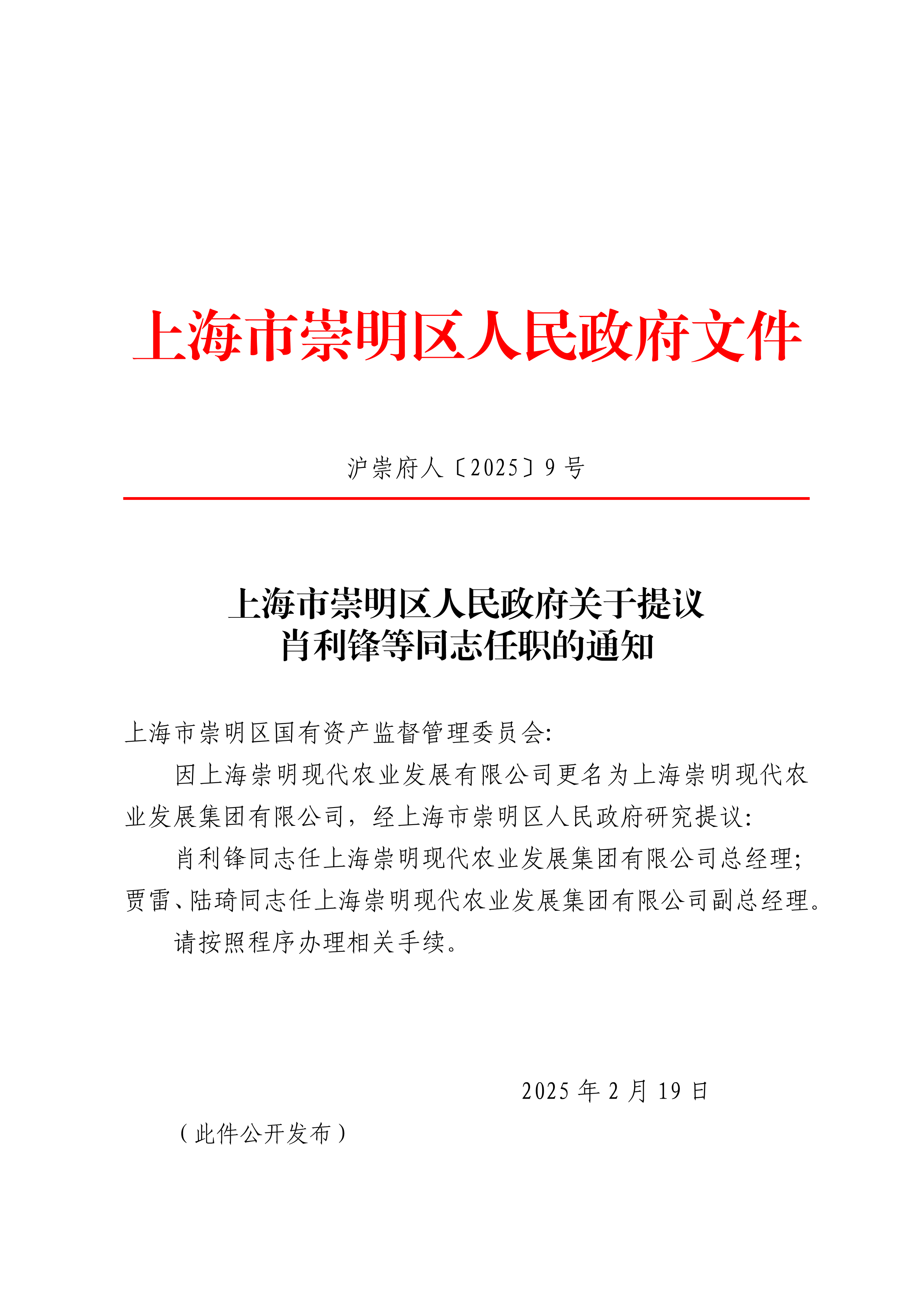 肖利锋同志任上海崇明现代农业发展集团有限公司总经理;贾雷、陆琦同志任上海崇明现代农业发展集团有限公司副总经理。