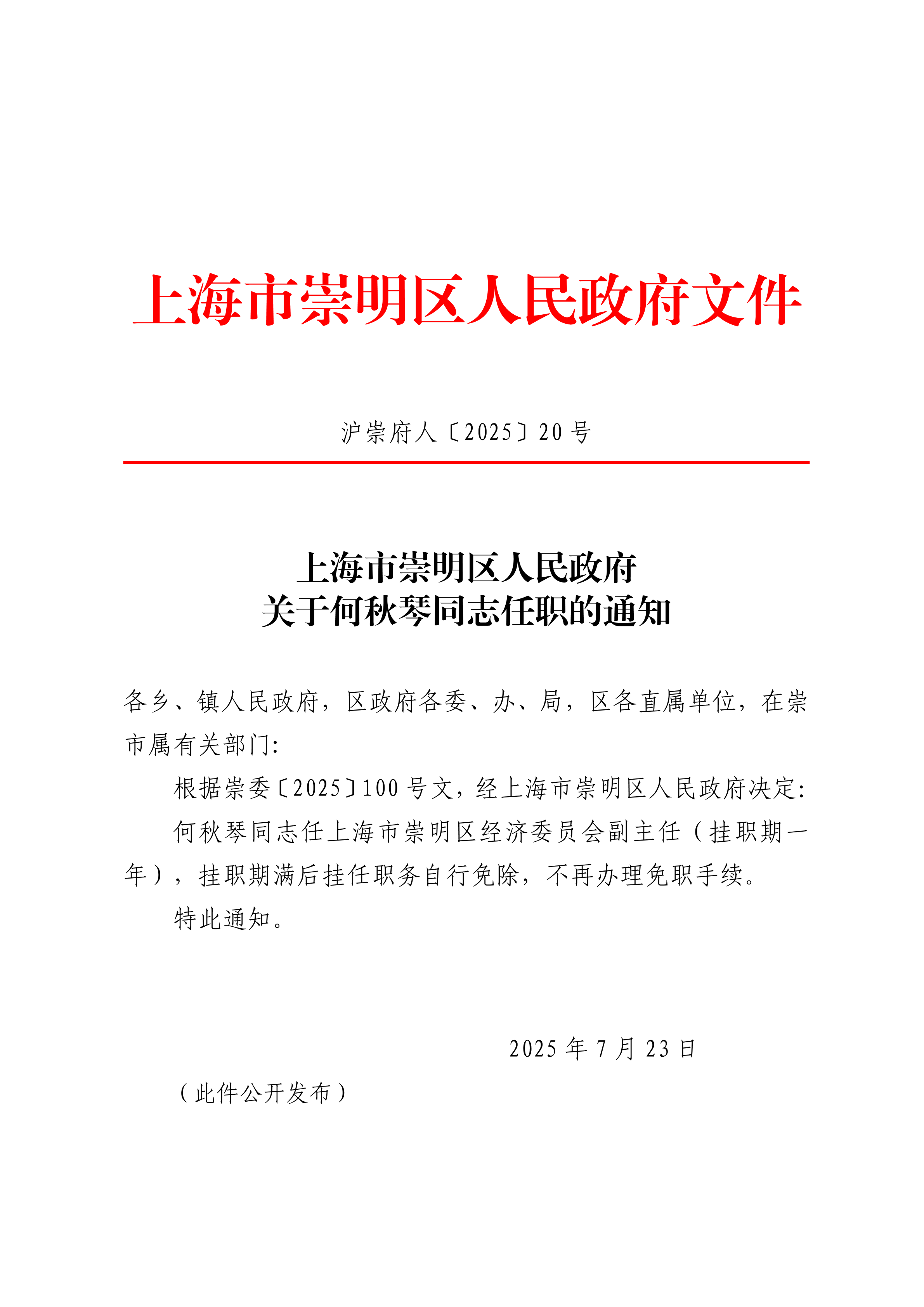 何秋琴同志任上海市崇明区经济委员会副主任(挂职期一年),挂职期满后挂任职务自行免除,不再办理免职手续。