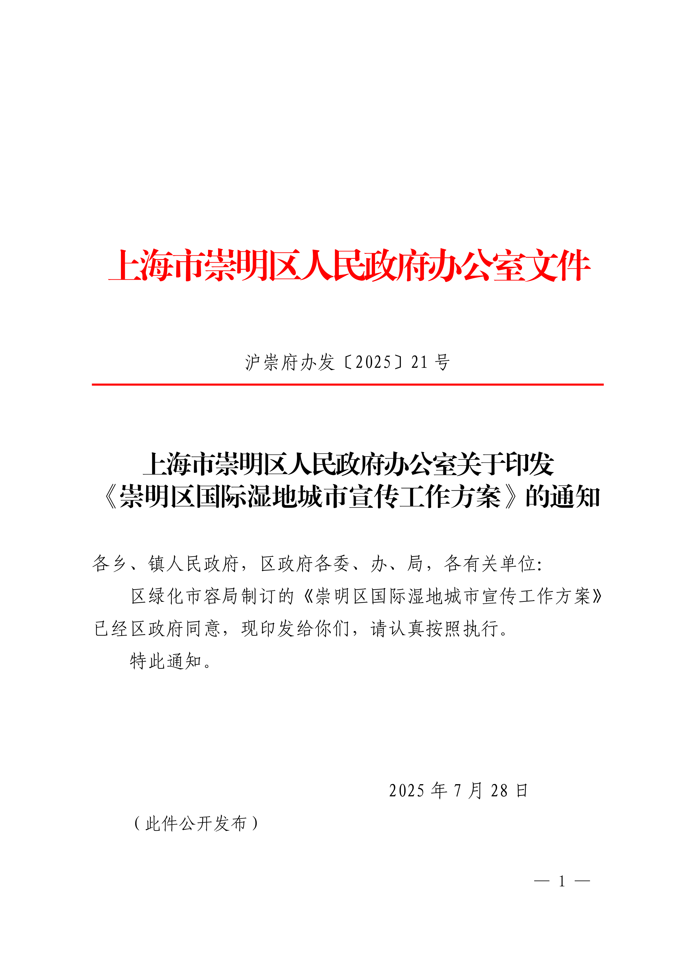 区绿化市容局制订的《崇明区国际湿地城市宣传工作方案》已经区政府同意,现印发给你们,请认真按照执行。
