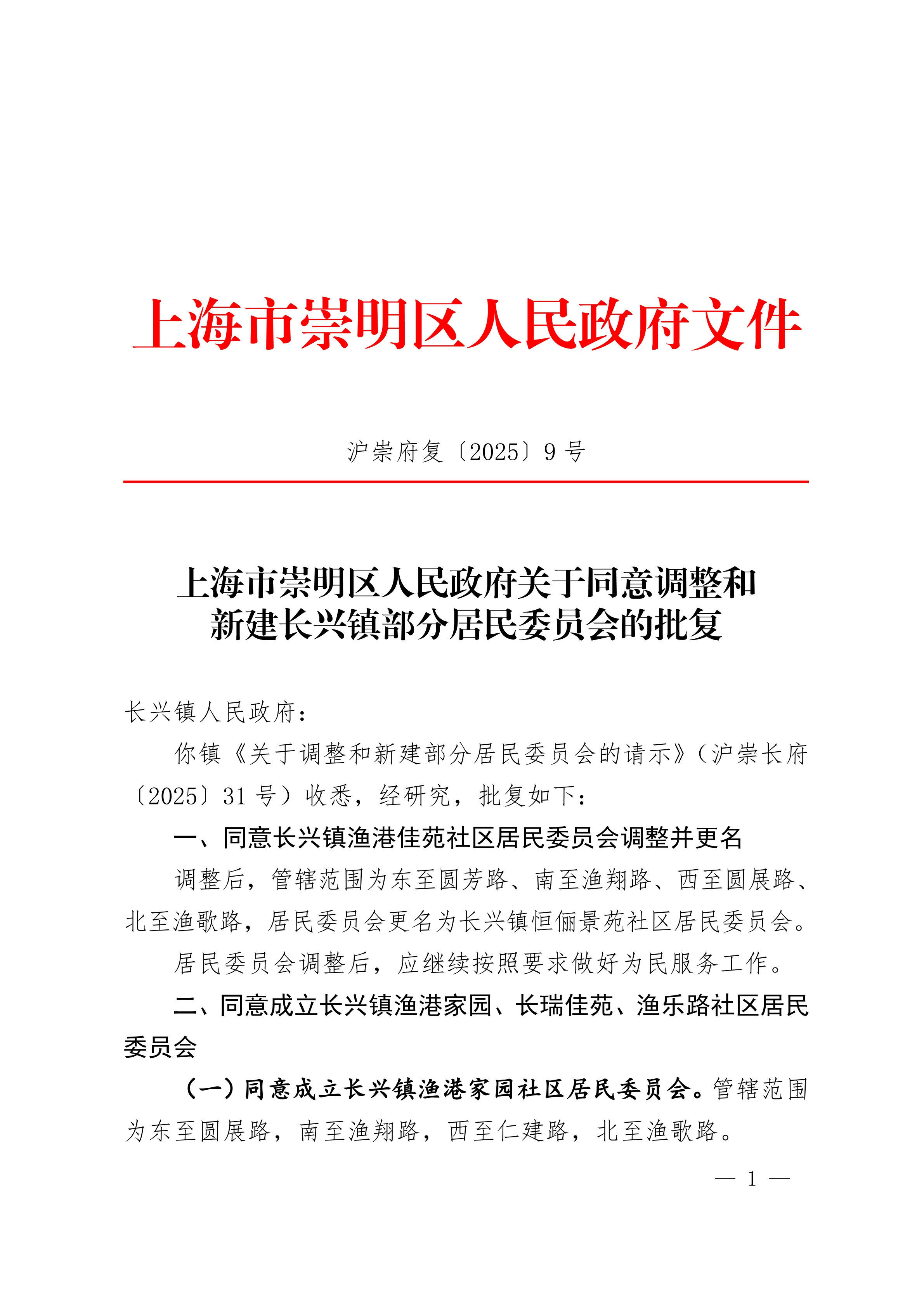 你镇《关于调整和新建部分居民委员会的请示》(沪崇长府〔2025〕31号)收悉,经研究,批复如下: