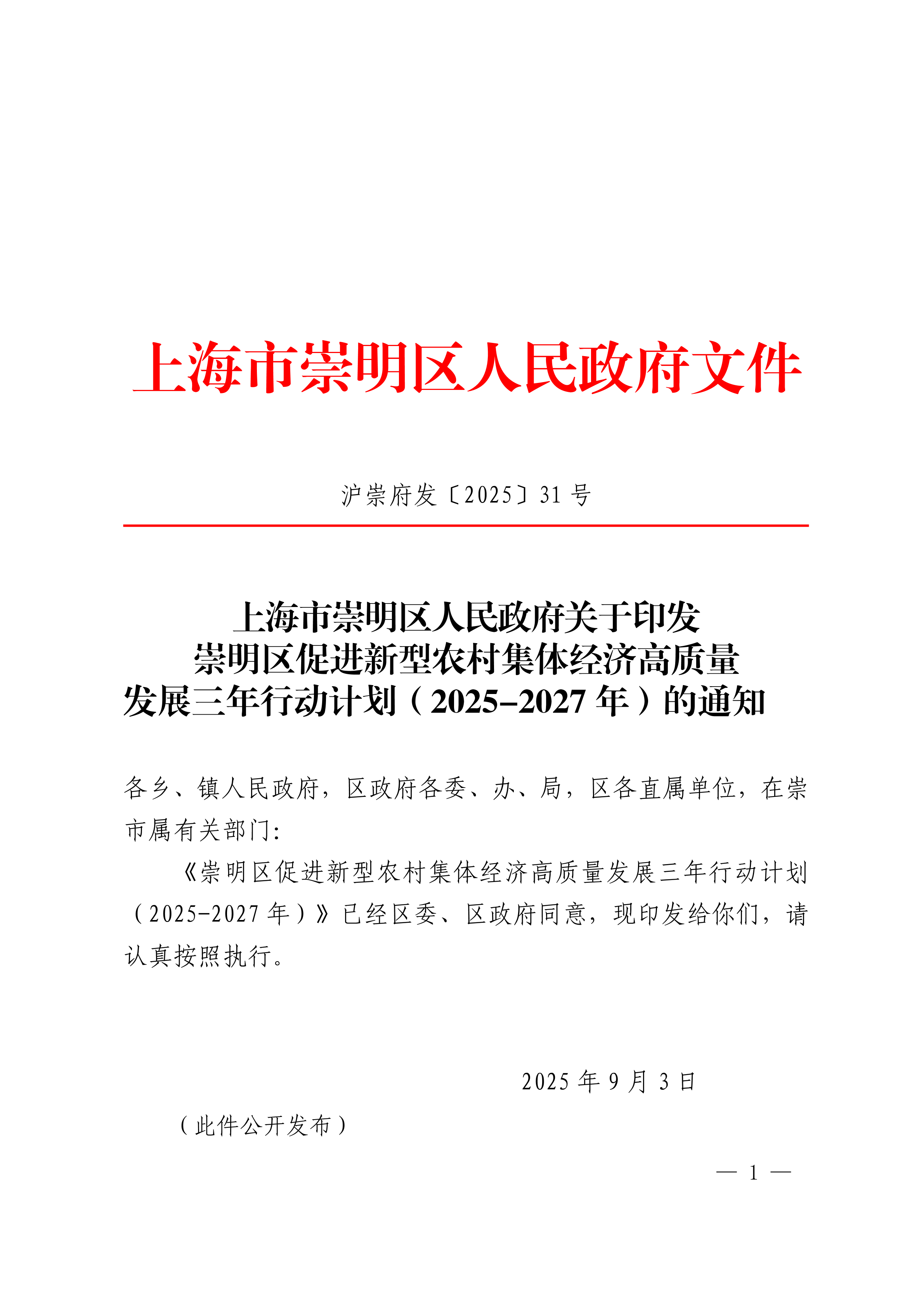 《崇明区促进新型农村集体经济高质量发展三年行动计划(2025-2027年)》已经区委、区政府同意,现印发给你们,请认真按照执行。