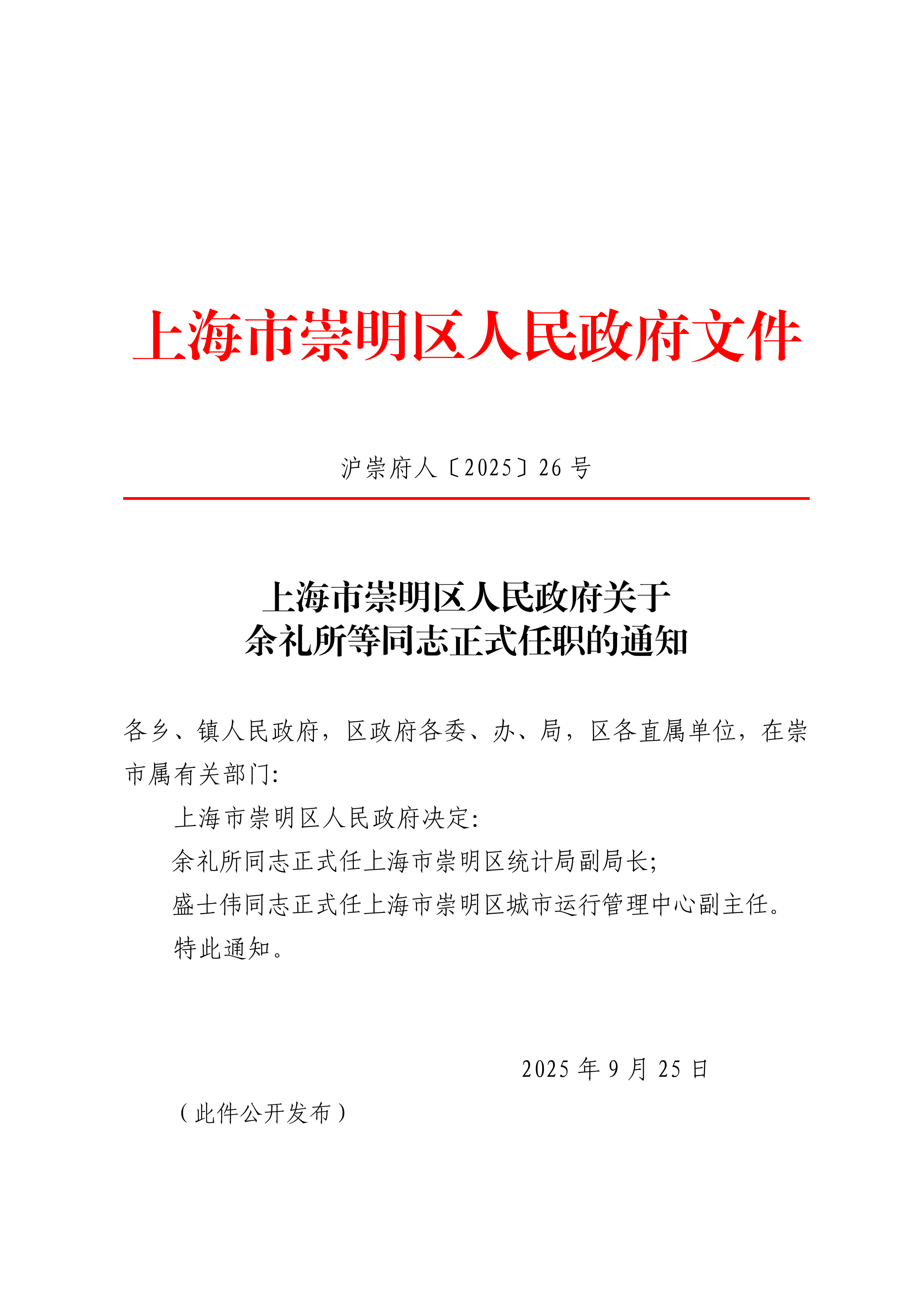 盛士伟同志正式任上海市崇明区城市运行管理中心副主任。