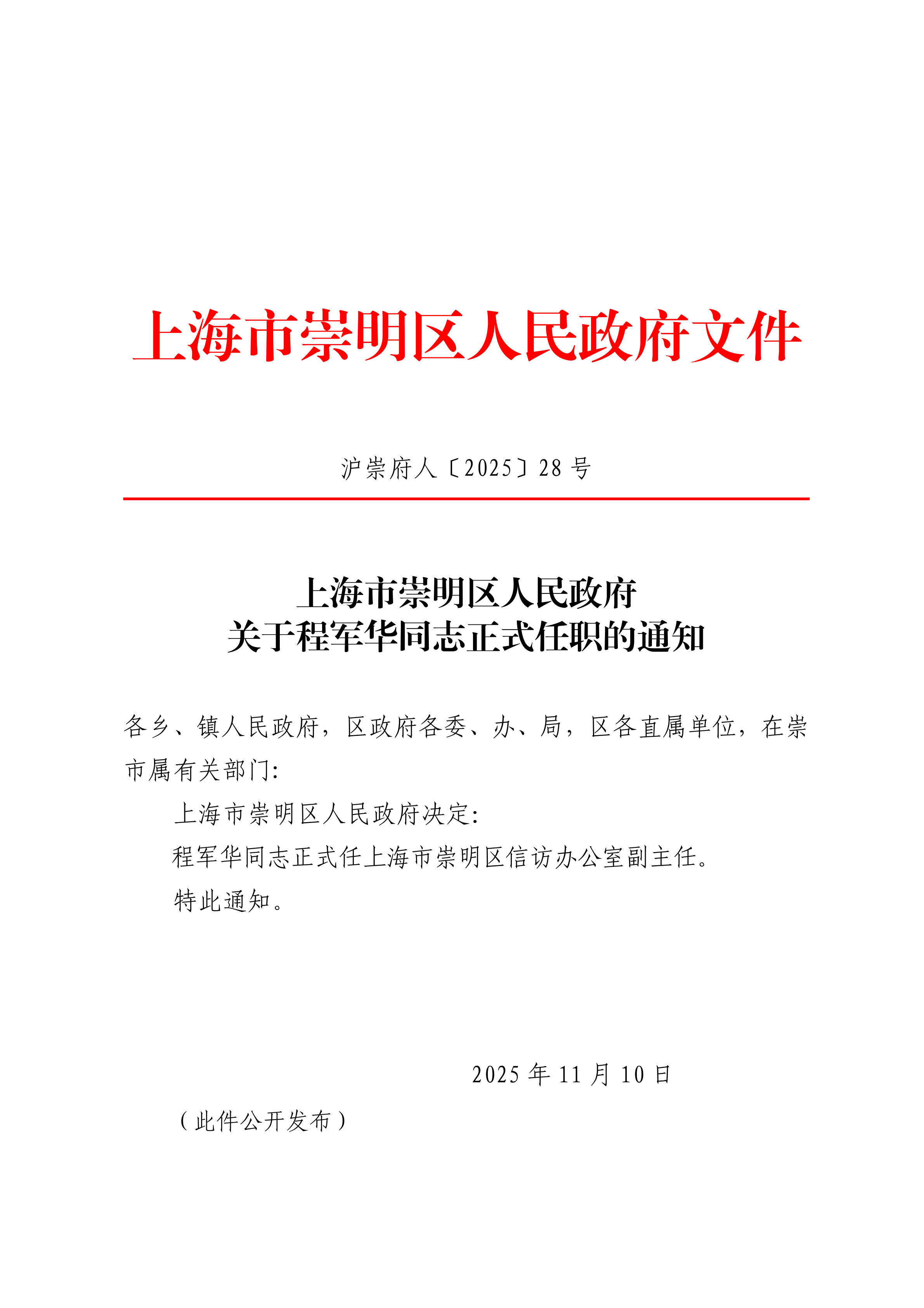 程军华同志正式任上海市崇明区信访办公室副主任。