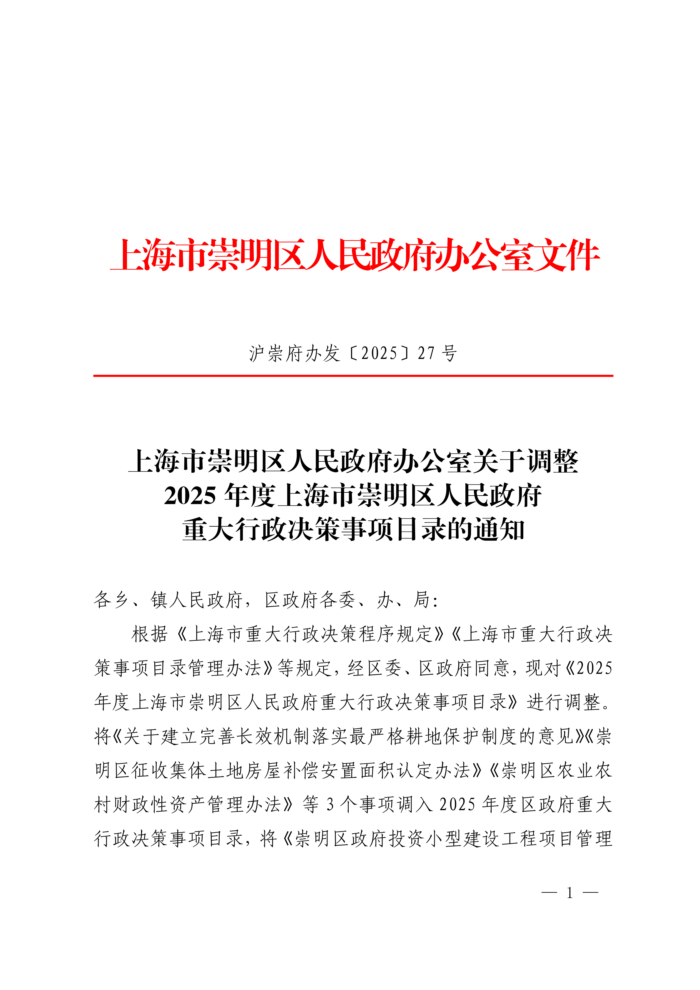 根据《上海市重大行政决策程序规定》《上海市重大行政决策事项目录管理办法》等规定,经区委、区政府同意,现对《2025年度上海市崇明区人民政府重大行政决策事项目录》进行调整。将《关于建立完善长效机制落实最严格耕地保护制度的意见》《崇明区征收集体土地房屋补偿安置面积认定办法》《崇明区农业农村财政性资产管理办法》等3个事项调入2025年度区政府重大行政决策事项目录,将《崇明区政府投资小型建设工程项目管理办法》《崇明区海绵城市规划》等2个事项调出2025年度区政府重大行政决策事项目录。请各承办单位认真组织实施,按照规定严格履行法定程序。