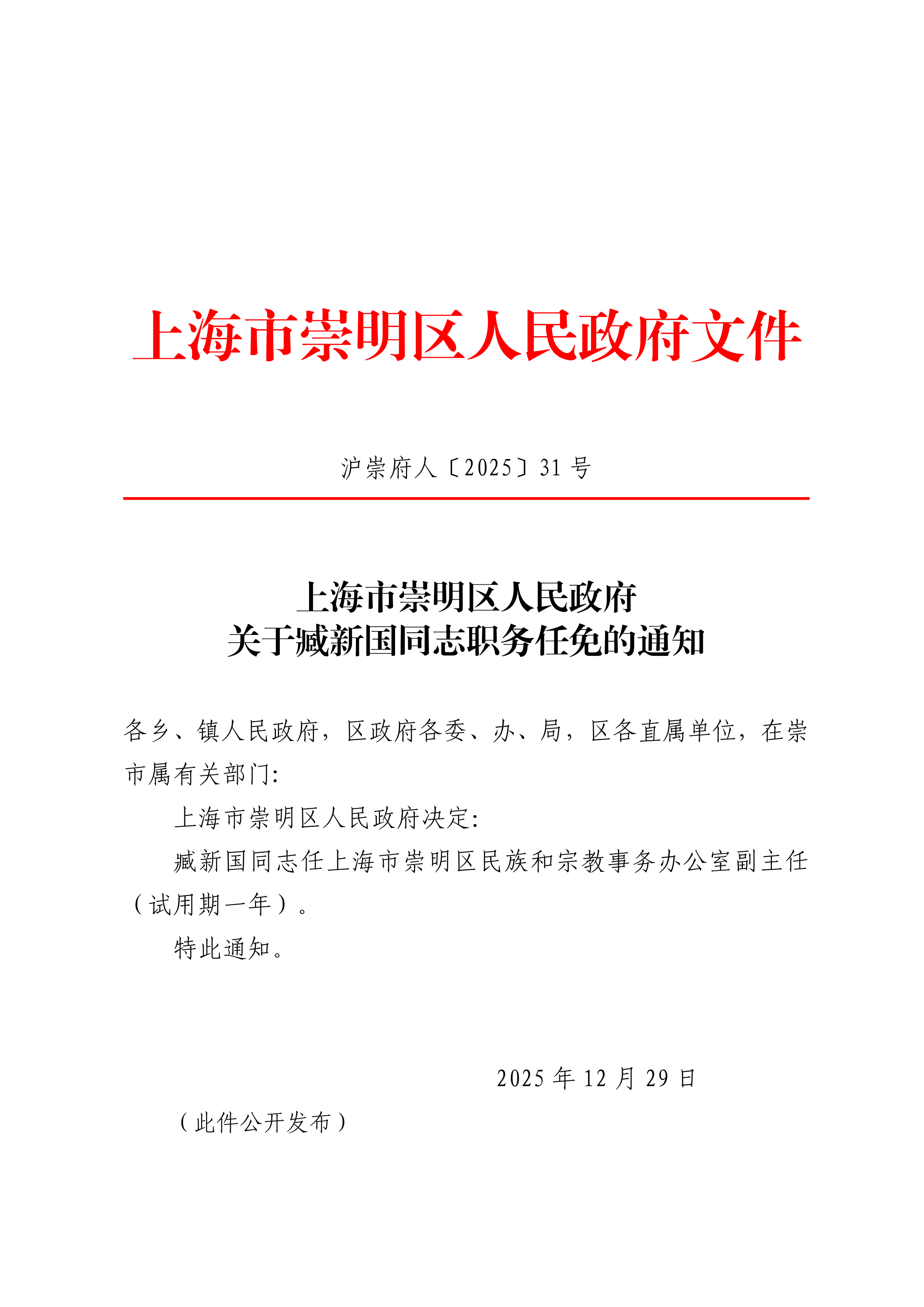 臧新国同志任上海市崇明区民族和宗教事务办公室副主任(试用期一年)。