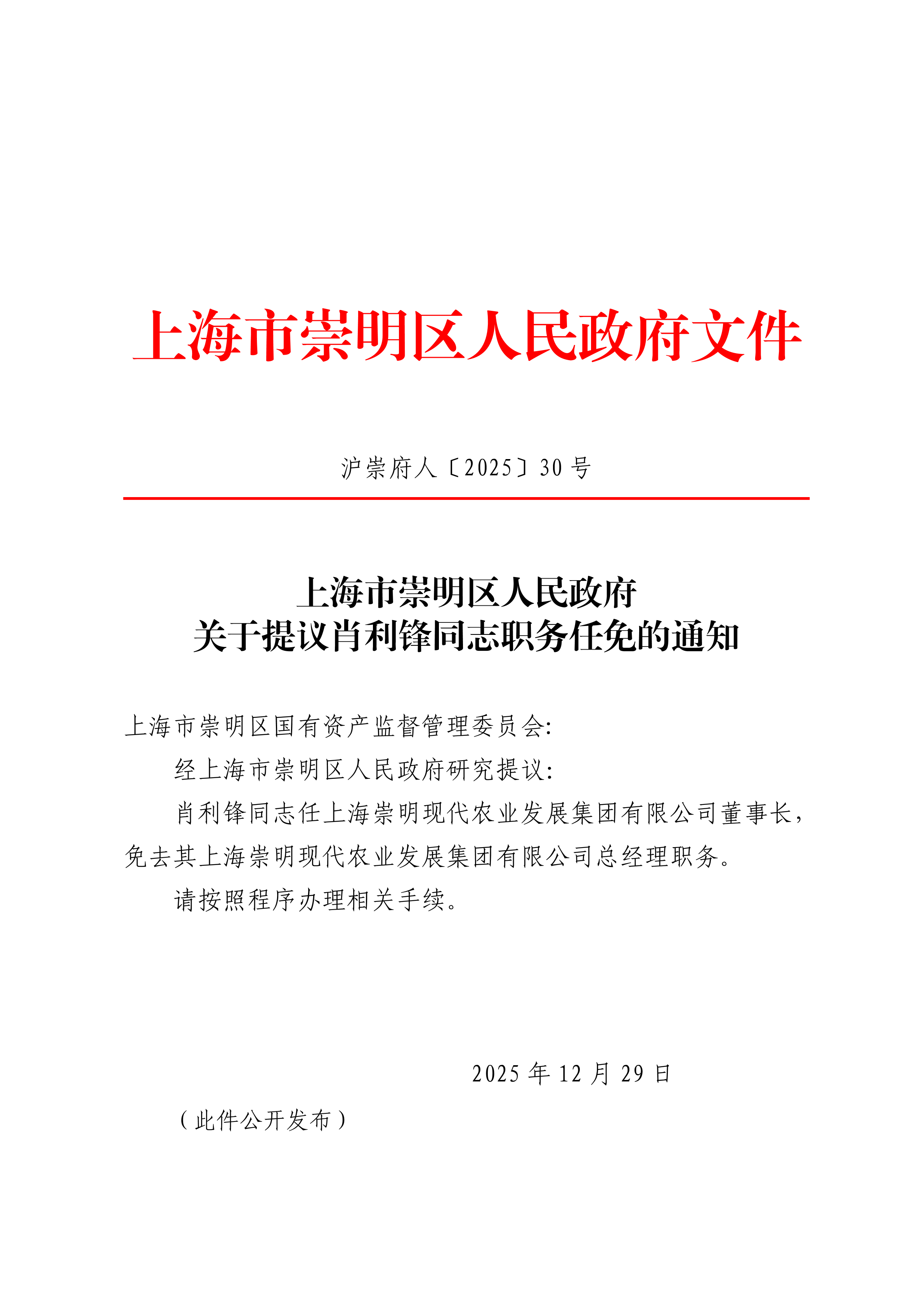 肖利锋同志任上海崇明现代农业发展集团有限公司董事长,免去其上海崇明现代农业发展集团有限公司总经理职务。