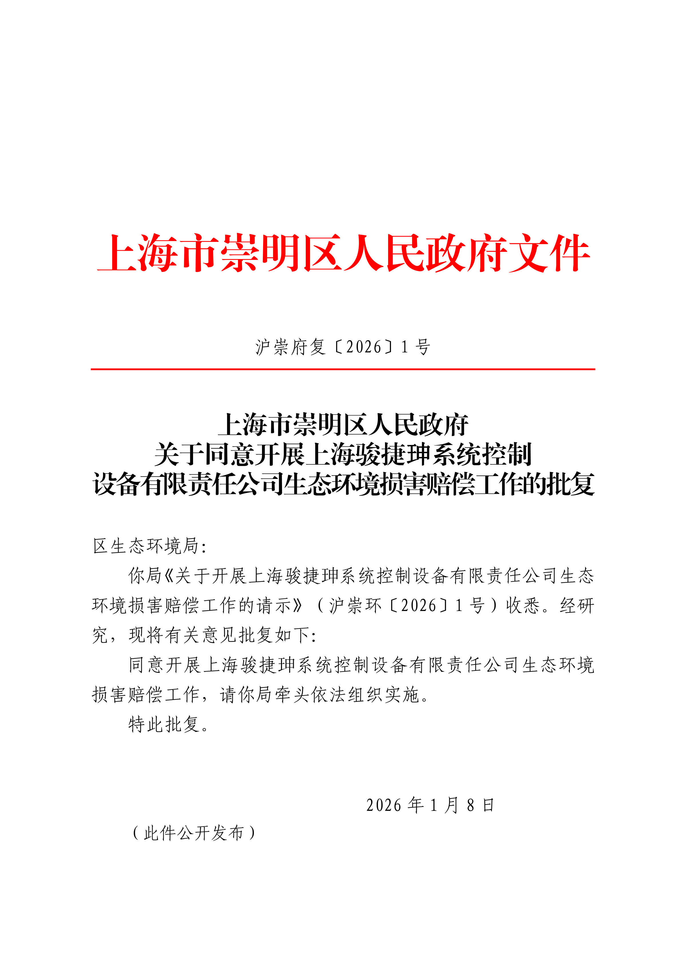 你局《关于开展上海骏捷珅系统控制设备有限责任公司生态环境损害赔偿工作的请示》(沪崇环〔2026〕1号)收悉。经研究,现将有关意见批复如下: