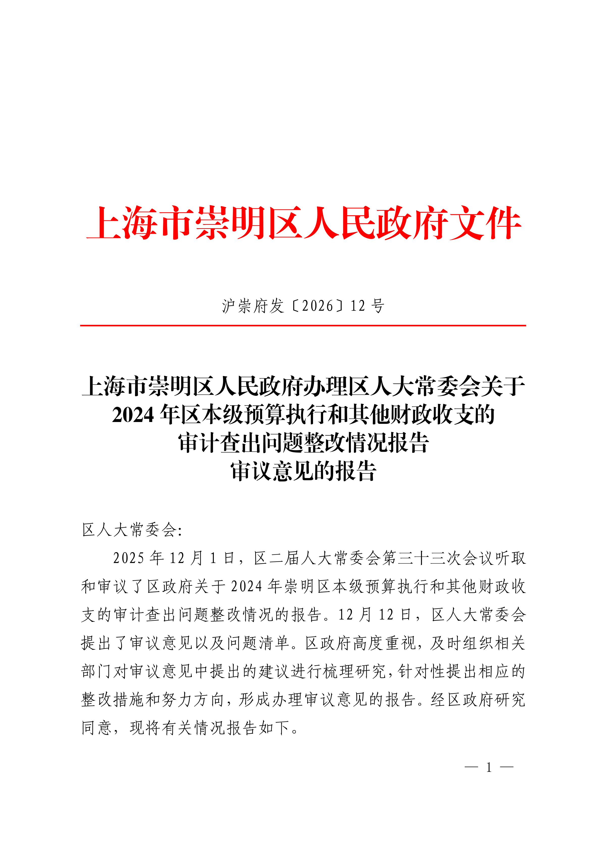 2025年12月1日,区二届人大常委会第三十三次会议听取和审议了区政府关于2024年崇明区本级预算执行和其他财政收支的审计查出问题整改情况的报告。12月12日,区人大常委会提出了审议意见以及问题清单。区政府高度重视,及时组织相关部门对审议意见中提出的建议进行梳理研究,针对性提出相应的整改措施和努力方向,形成办理审议意见的报告。经区政府研究同意,现将有关情况报告如下。