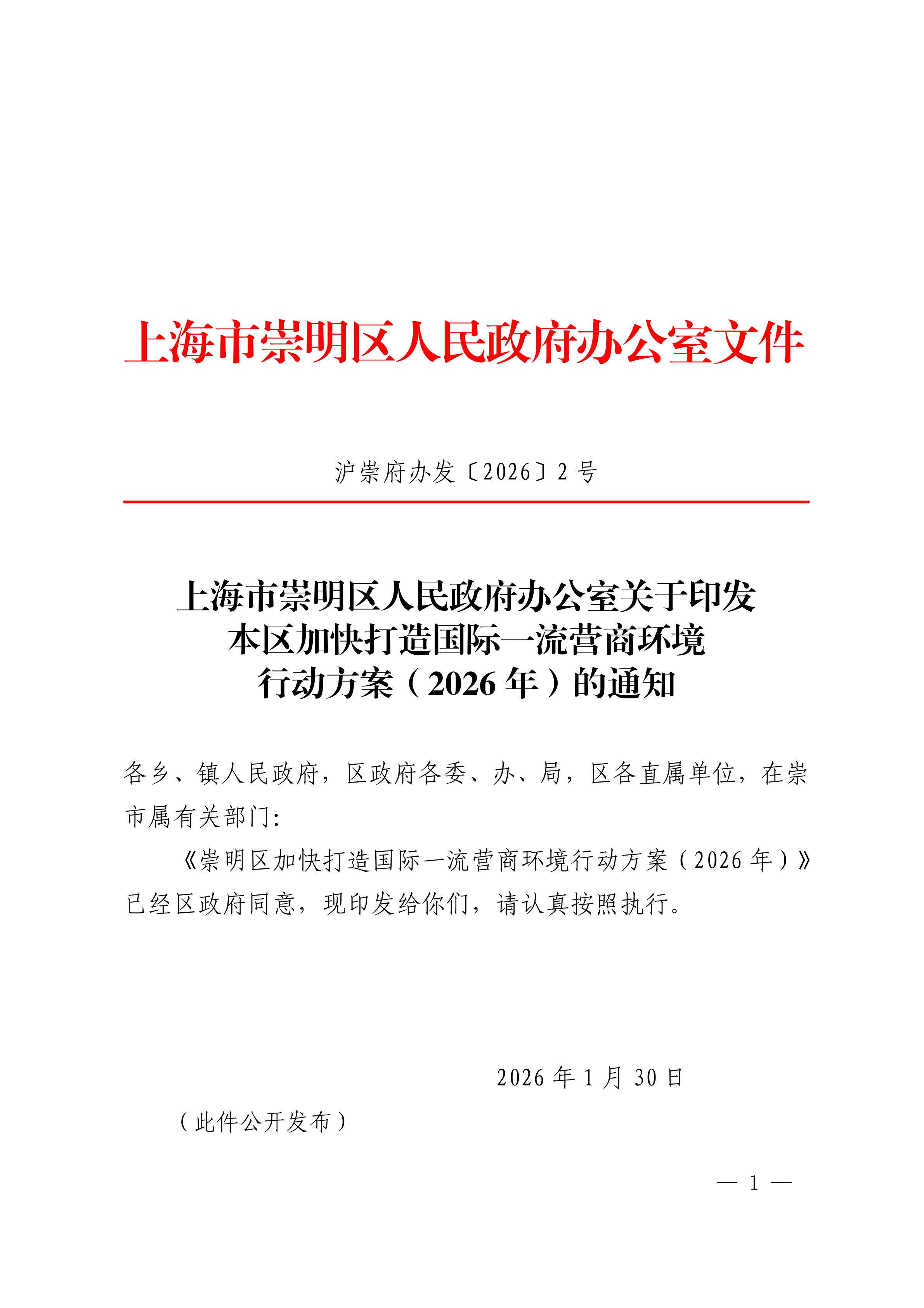 《崇明区加快打造国际一流营商环境行动方案(2026年)》已经区政府同意,现印发给你们,请认真按照执行。