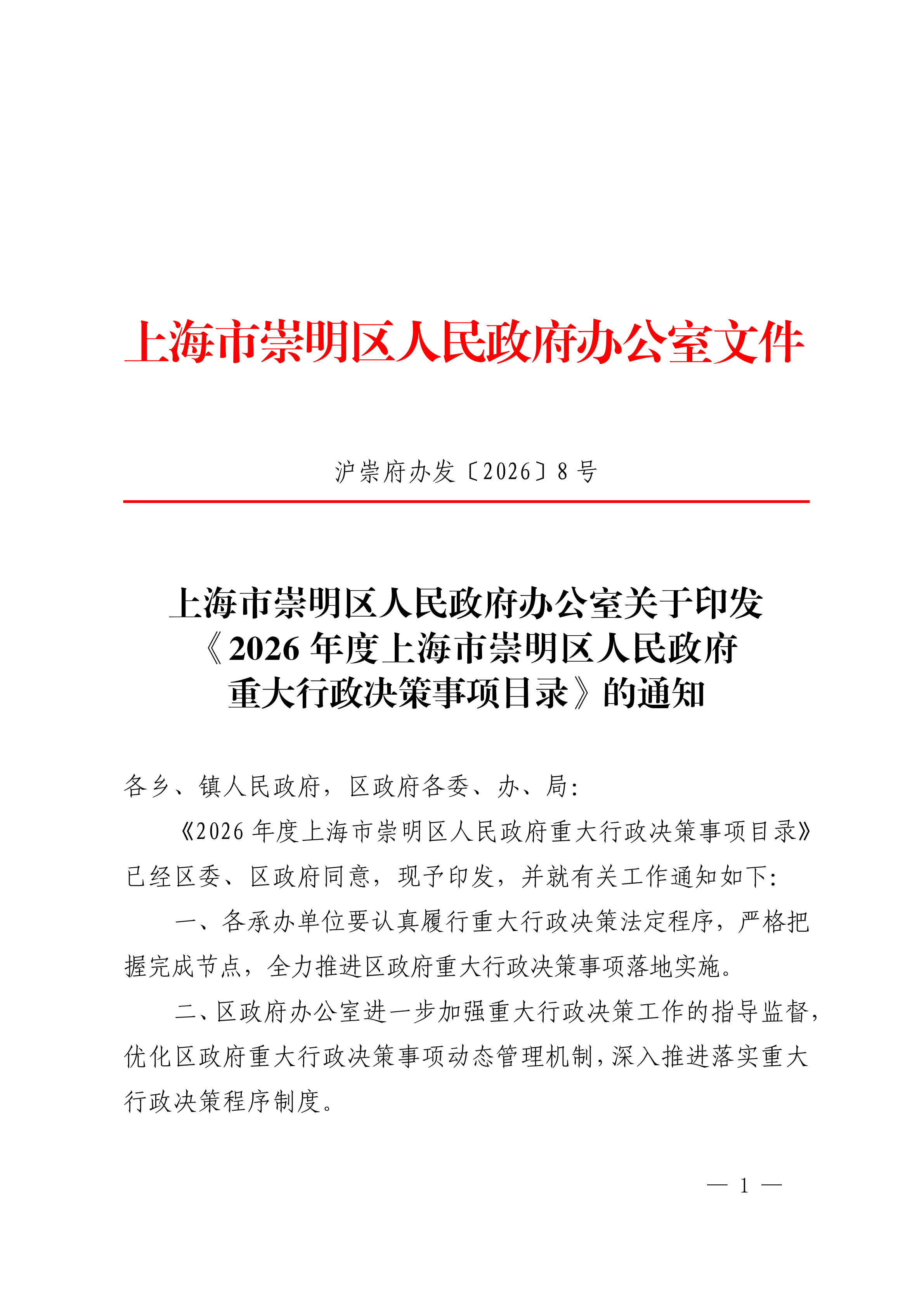 《2026年度上海市崇明区人民政府重大行政决策事项目录》已经区委、区政府同意,现予印发,并就有关工作通知如下: