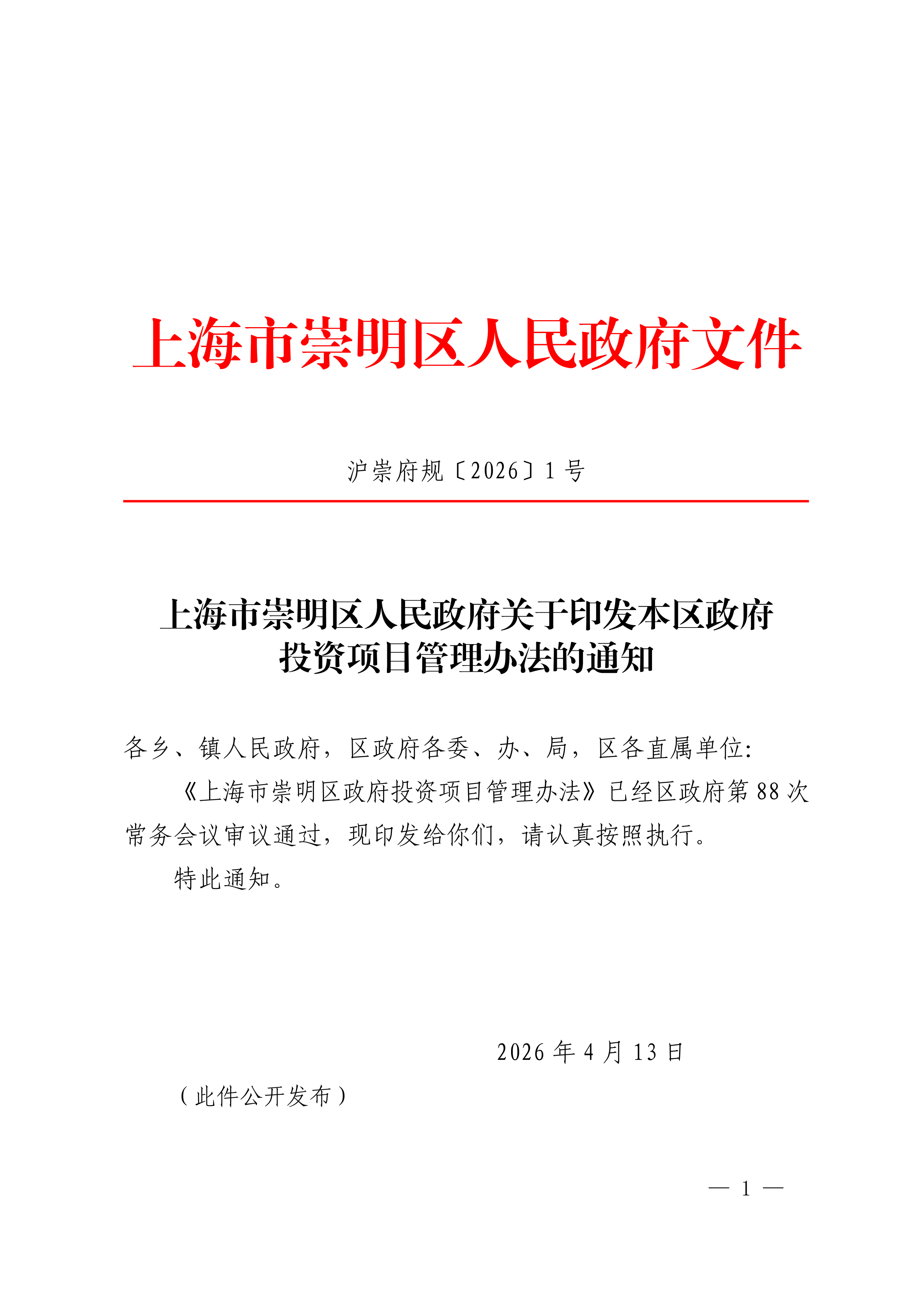 沪崇府规〔2026〕1号